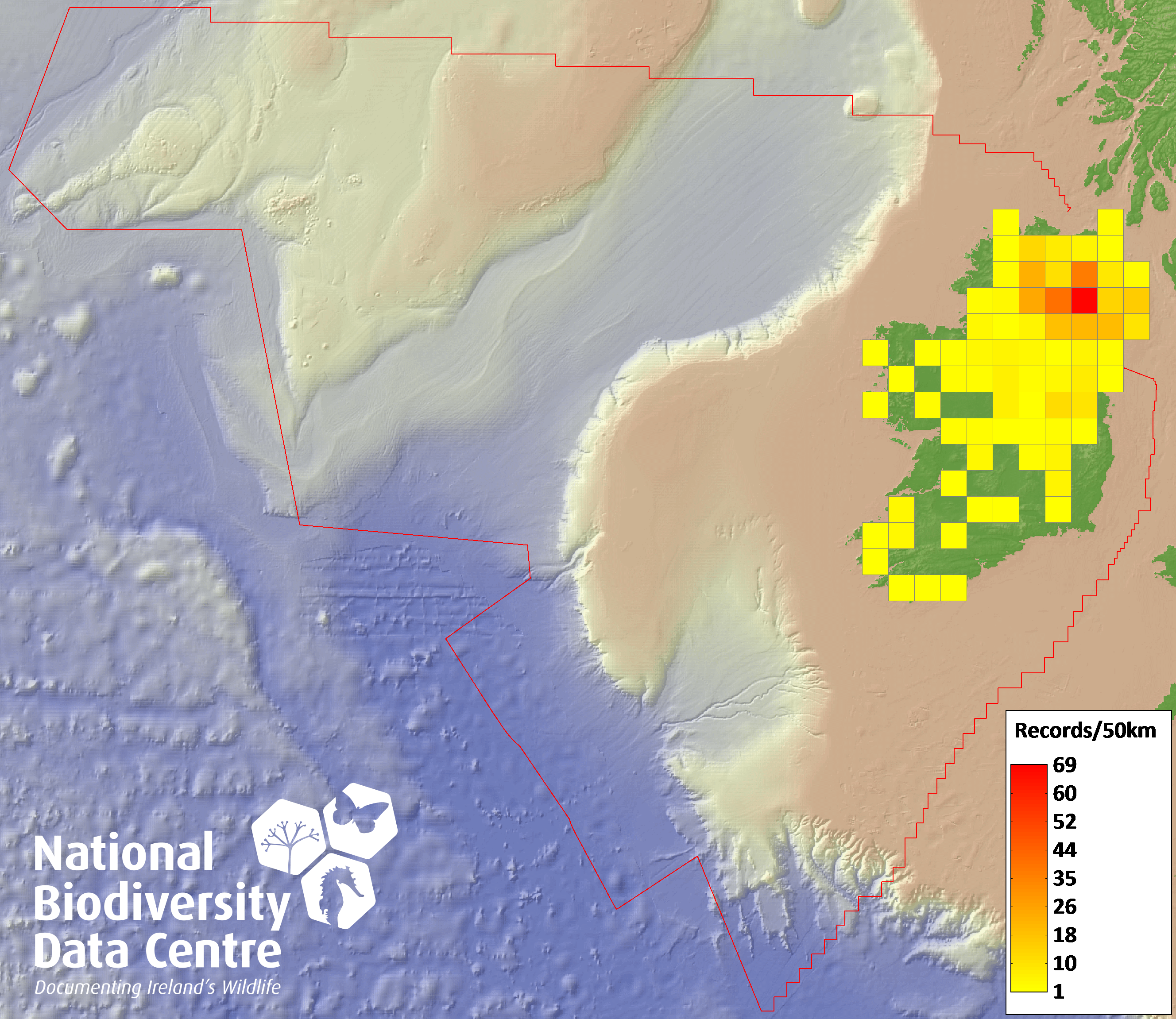 Distribution of the number of records recorded within each 10km grid square (ITM).Marine Map - 50km