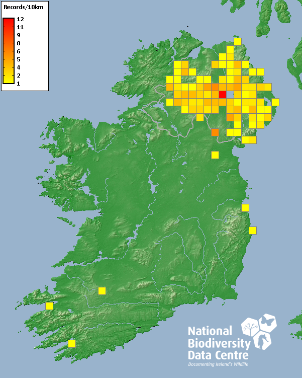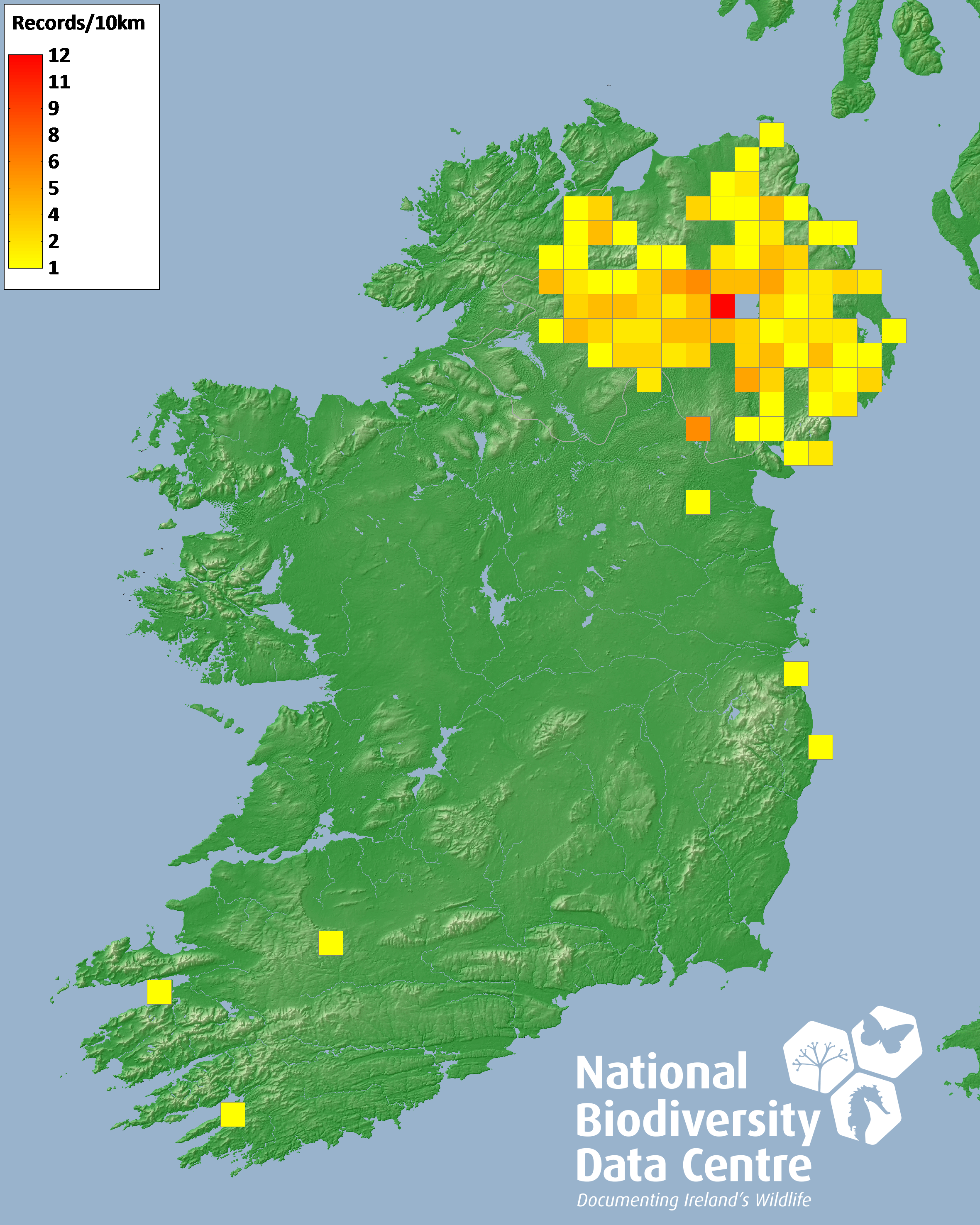 Distribution of the number of records recorded within each 10km grid square (ITM).Marine Map - 50km