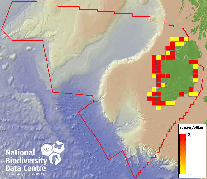 Distribution of the number of species recorded within each 10km grid square (ITM).Marine Map - 50Km
