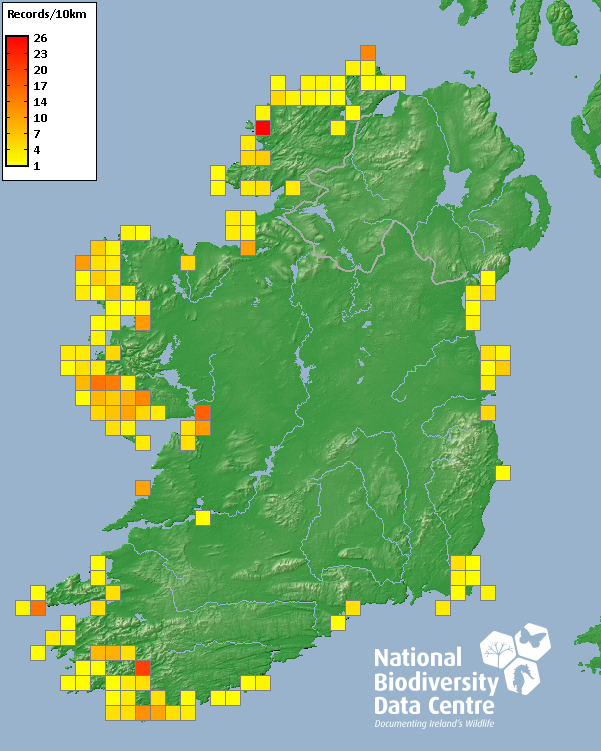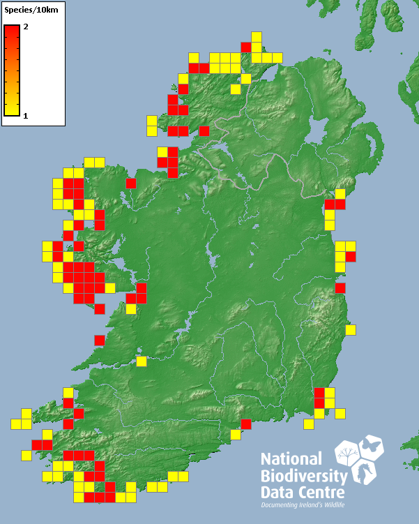 Distribution of the number of records within each 10km grid square (ITM).Marine Map - 50Km