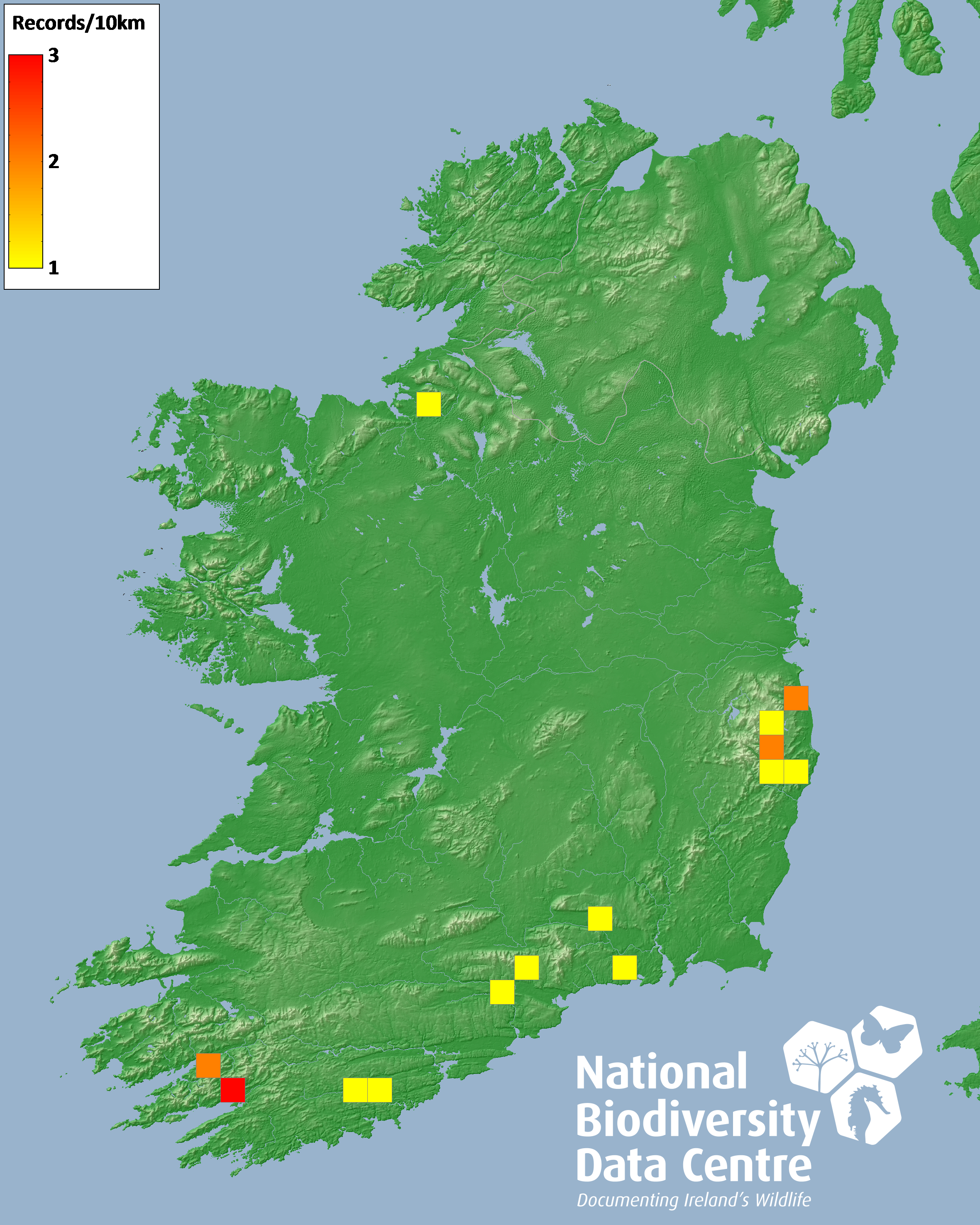 Distribution of the number of records recorded within each 10km grid square (ITM).Marine Map - 50km