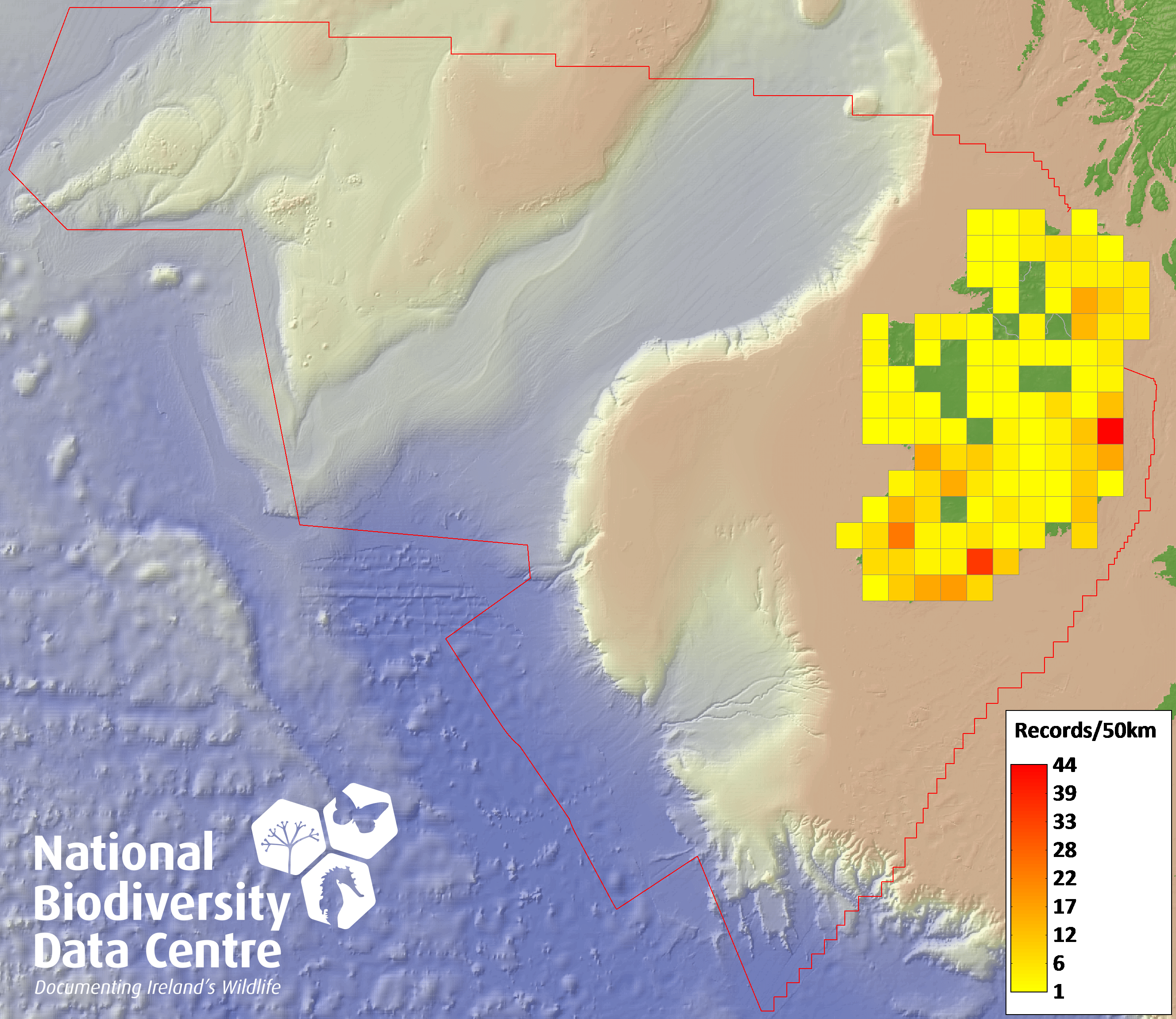 Distribution of the number of records recorded within each 10km grid square (ITM).Marine Map - 50km