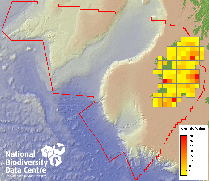 Distribution of the number of records recorded within each 10km grid square (ITM).Marine Map - 50km
