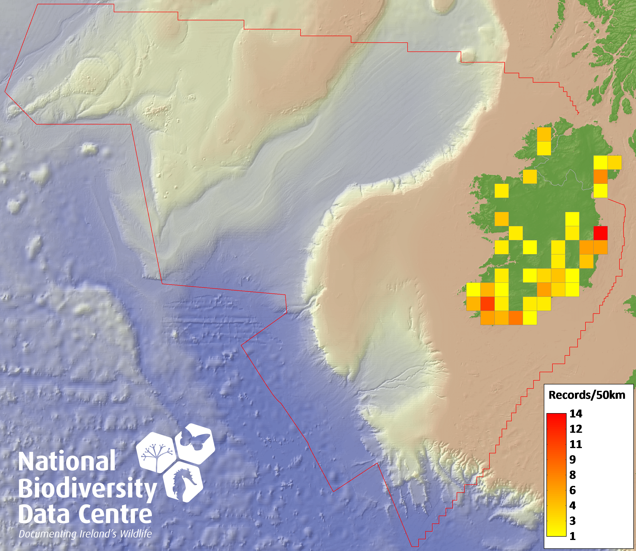 Distribution of the number of records recorded within each 10km grid square (ITM).Marine Map - 50km
