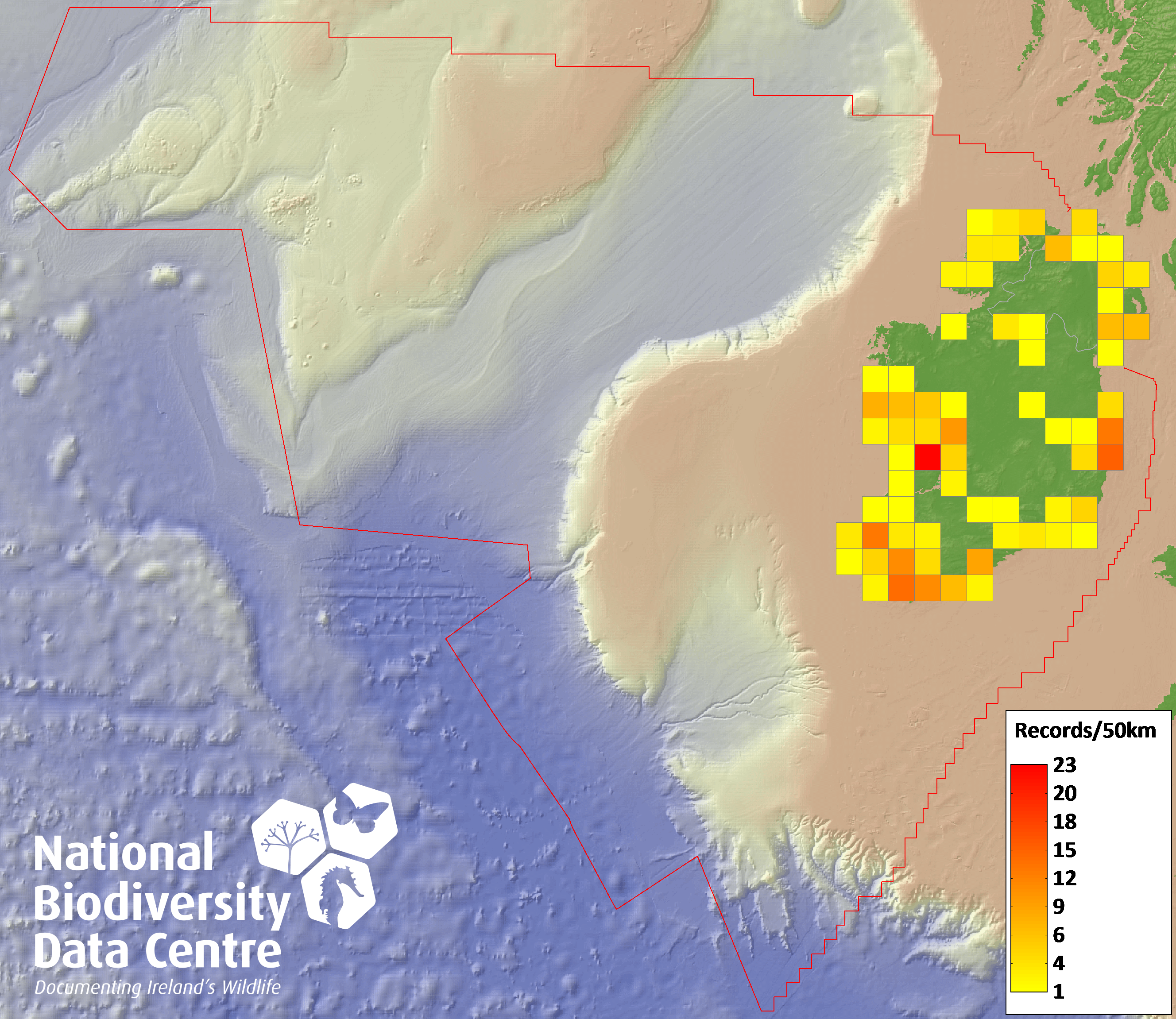Distribution of the number of records recorded within each 10km grid square (ITM).Marine Map - 50km