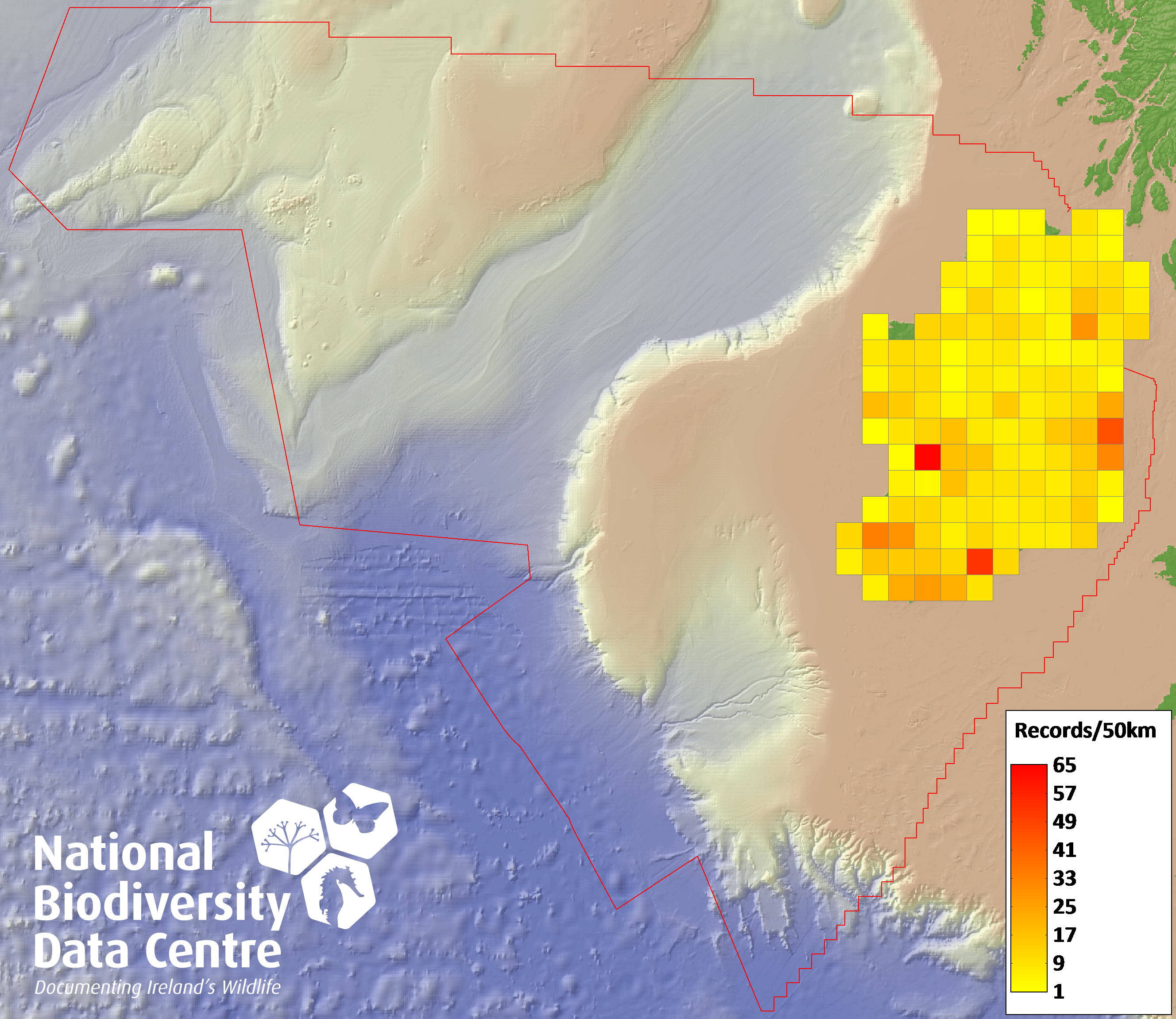 Distribution of the number of records recorded within each 10km grid square (ITM).Marine Map - 50km