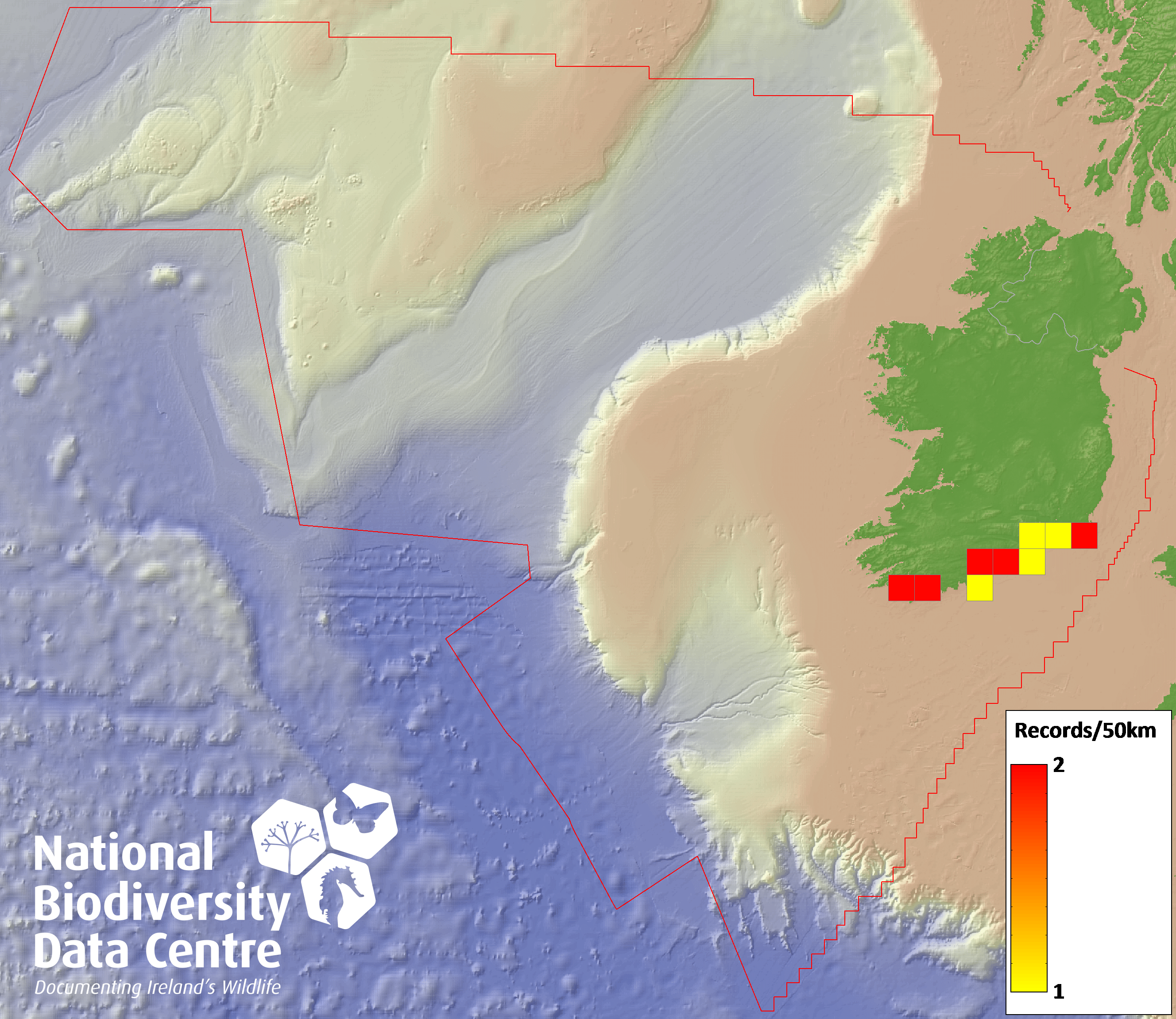 Distribution of the number of records recorded within each 10km grid square (ITM).Marine Map - 50km