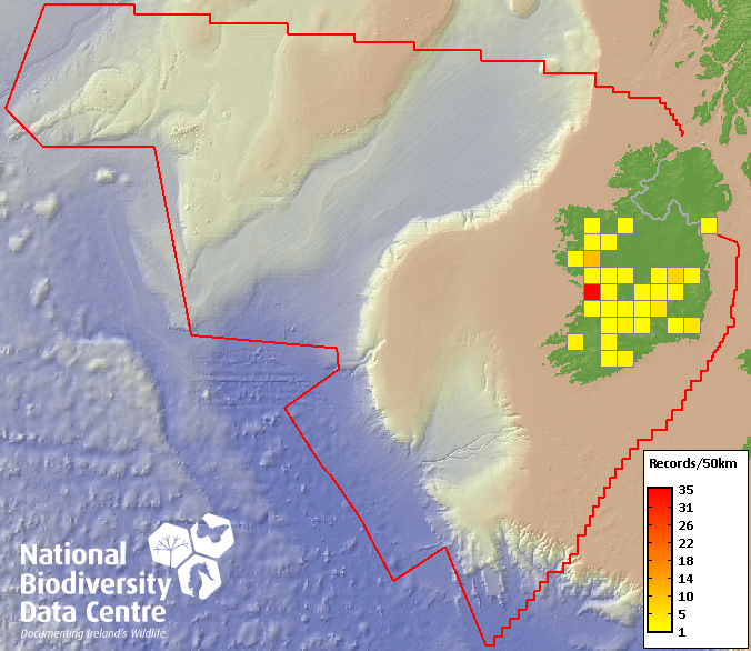 Distribution of the number of records within each 10km grid square (ITM).Marine Map - 50Km