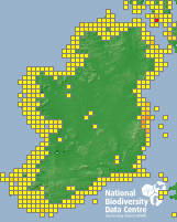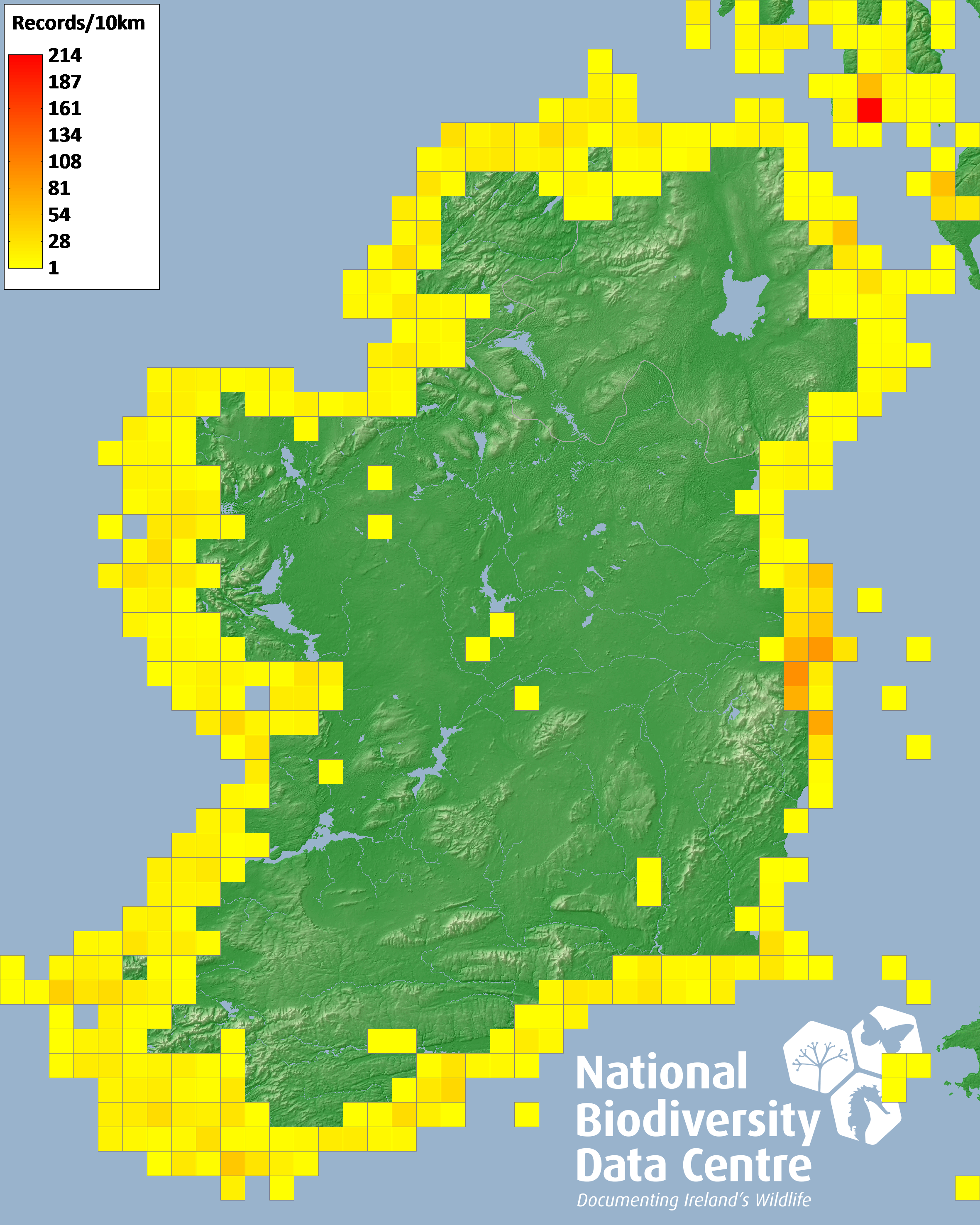 Distribution of the number of records recorded within each 10km grid square (ITM).Marine Map - 50km