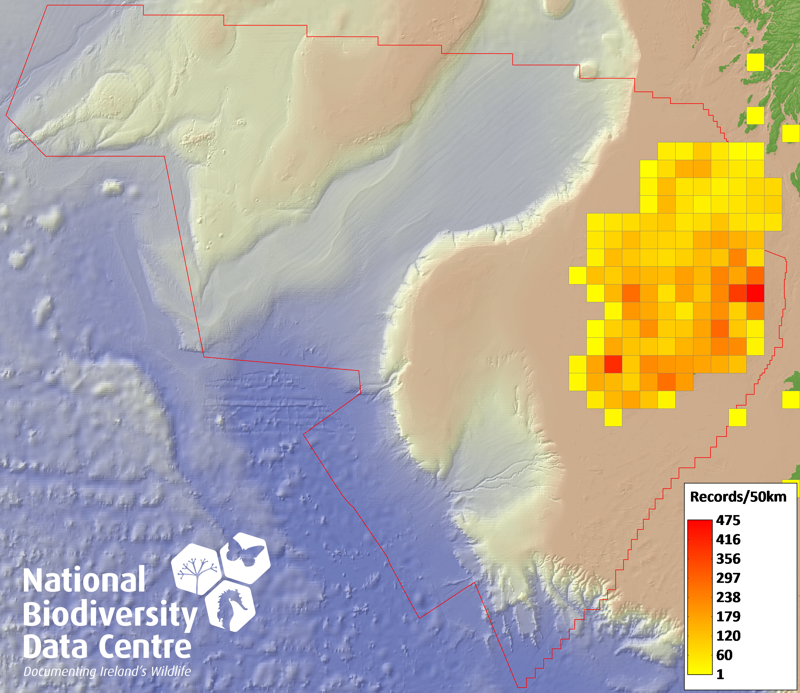 Distribution of the number of records recorded within each 10km grid square (ITM).Marine Map - 50km