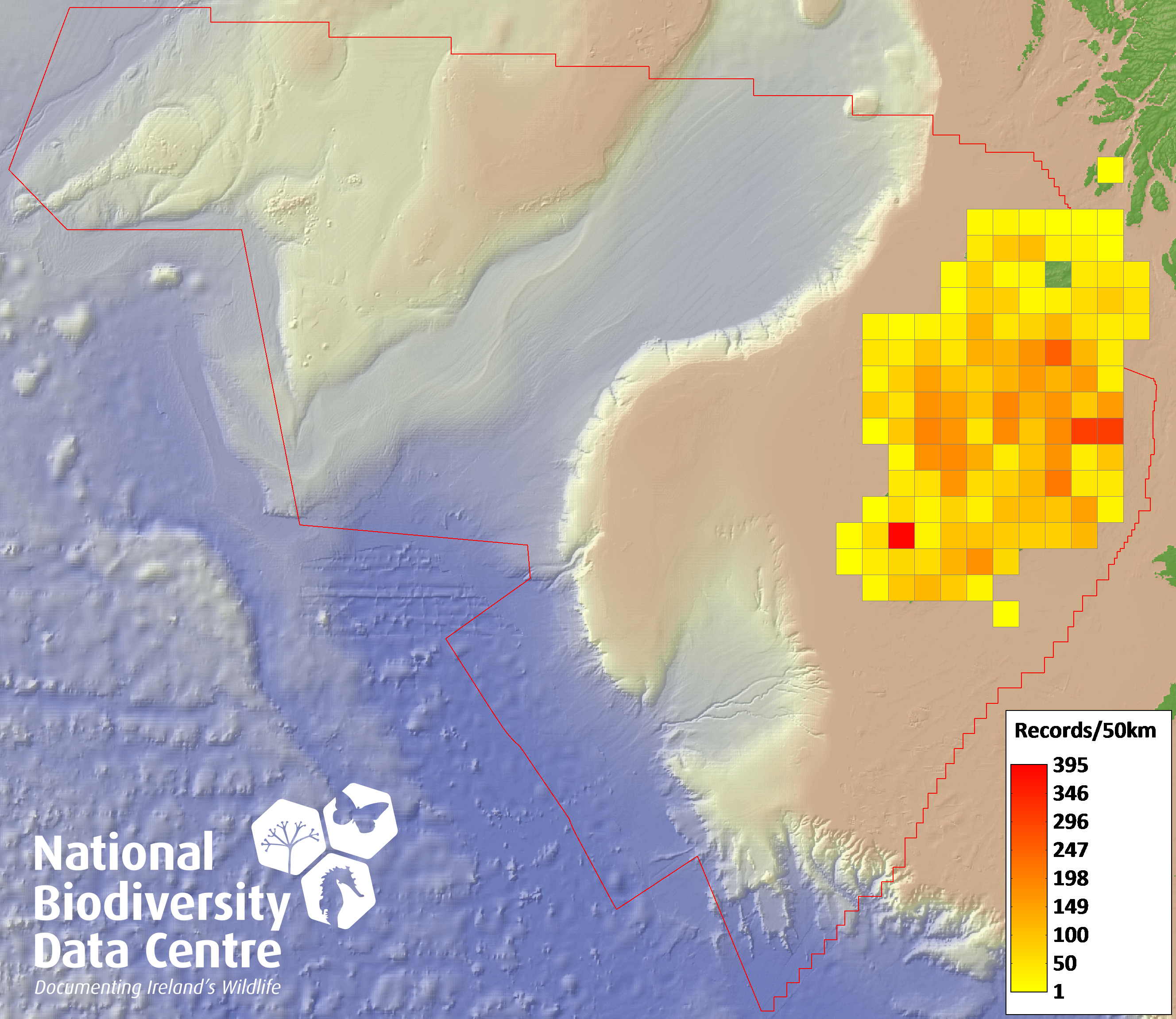 Distribution of the number of records recorded within each 10km grid square (ITM).Marine Map - 50km