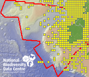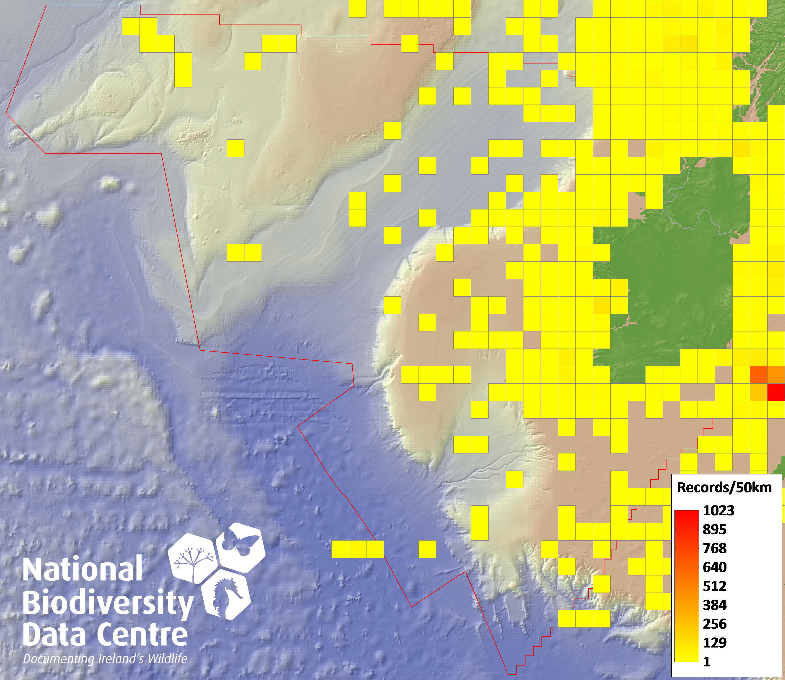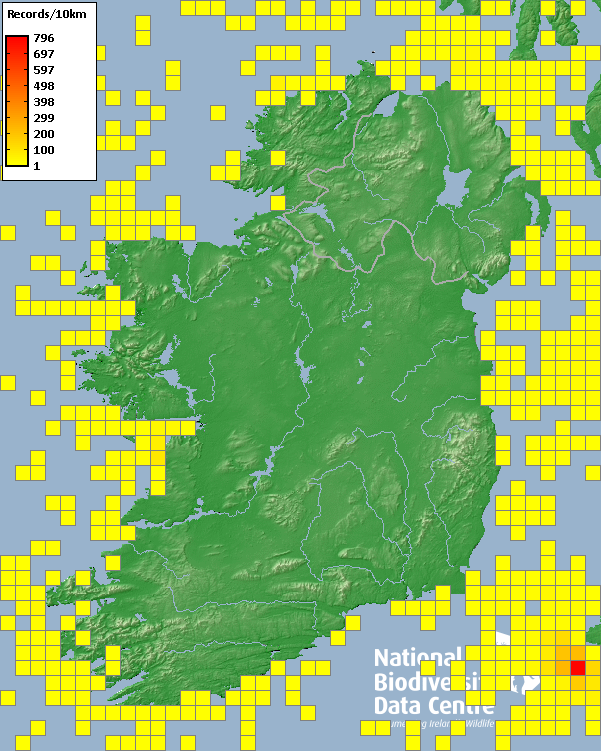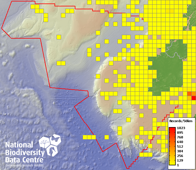 Distribution of the number of records recorded within each 10km grid square (ITM).Marine Map - 50km