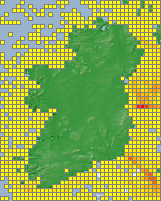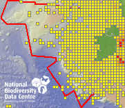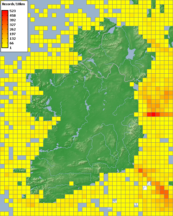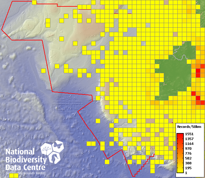 Distribution of the number of records recorded within each 10km grid square (ITM).Marine Map - 50km