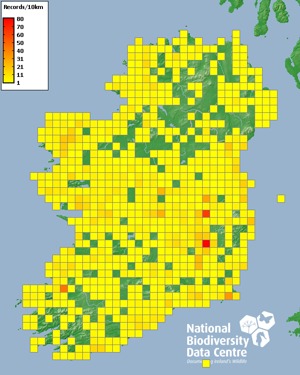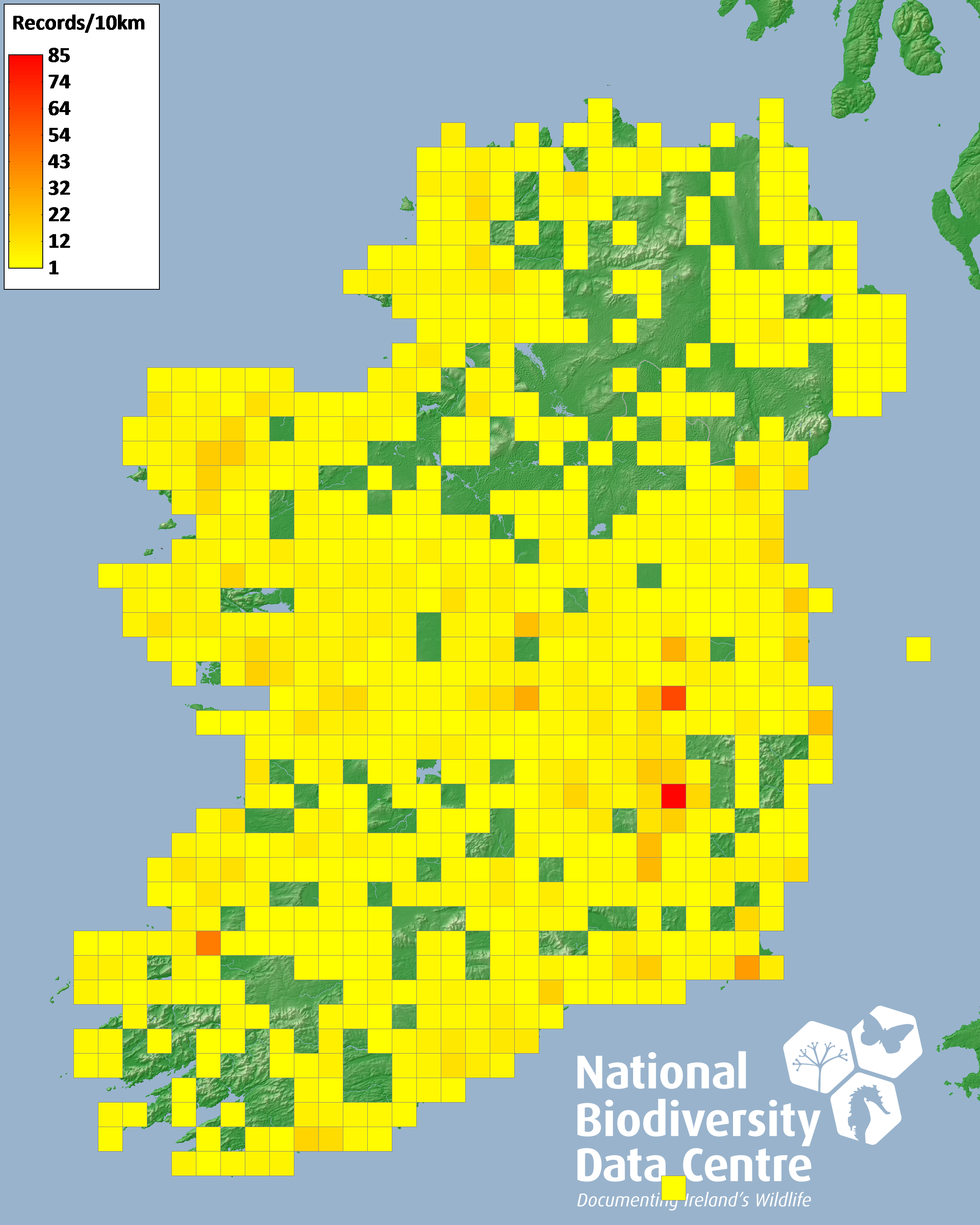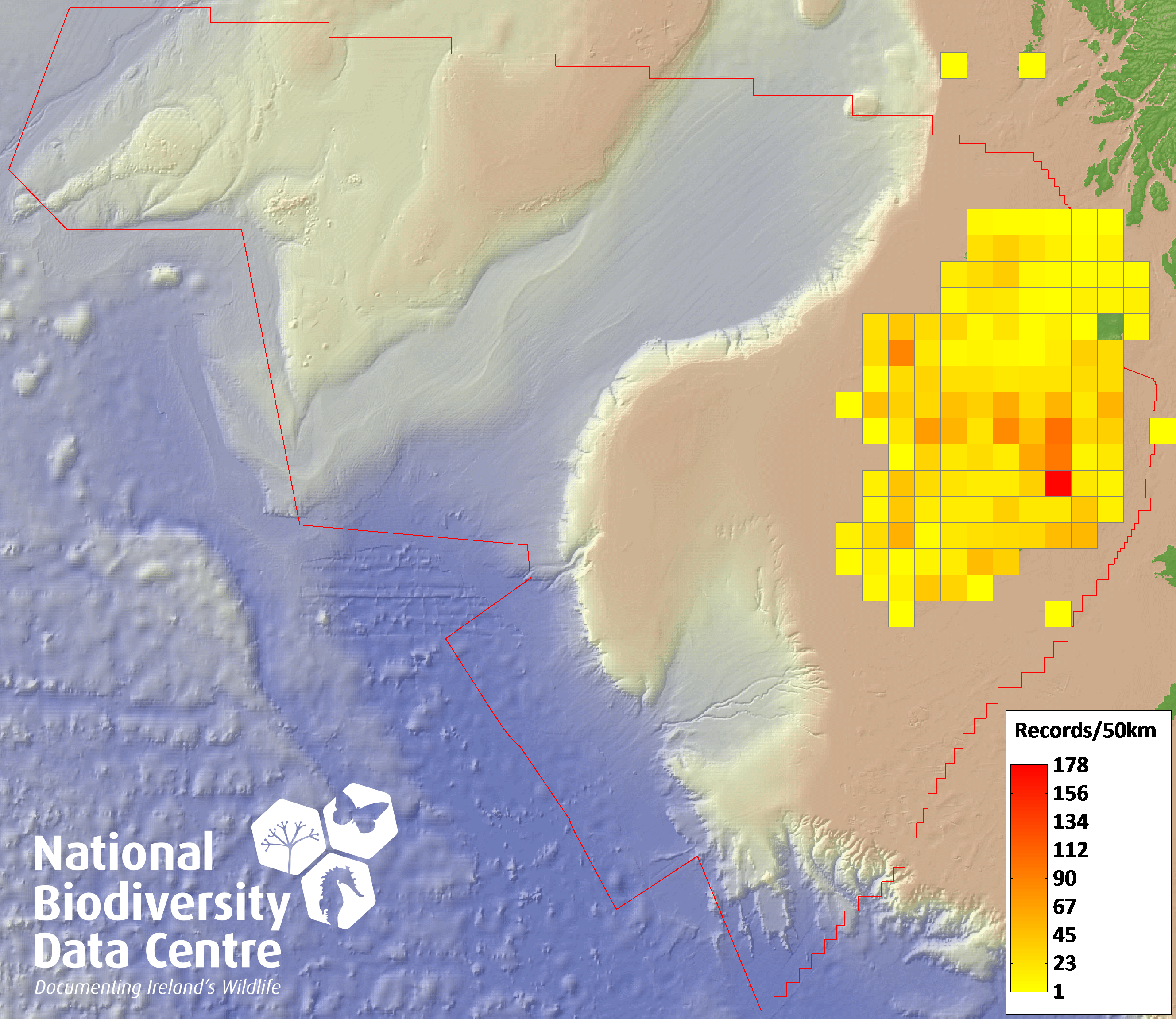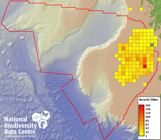 Distribution of the number of records recorded within each 10km grid square (ITM).Marine Map - 50km