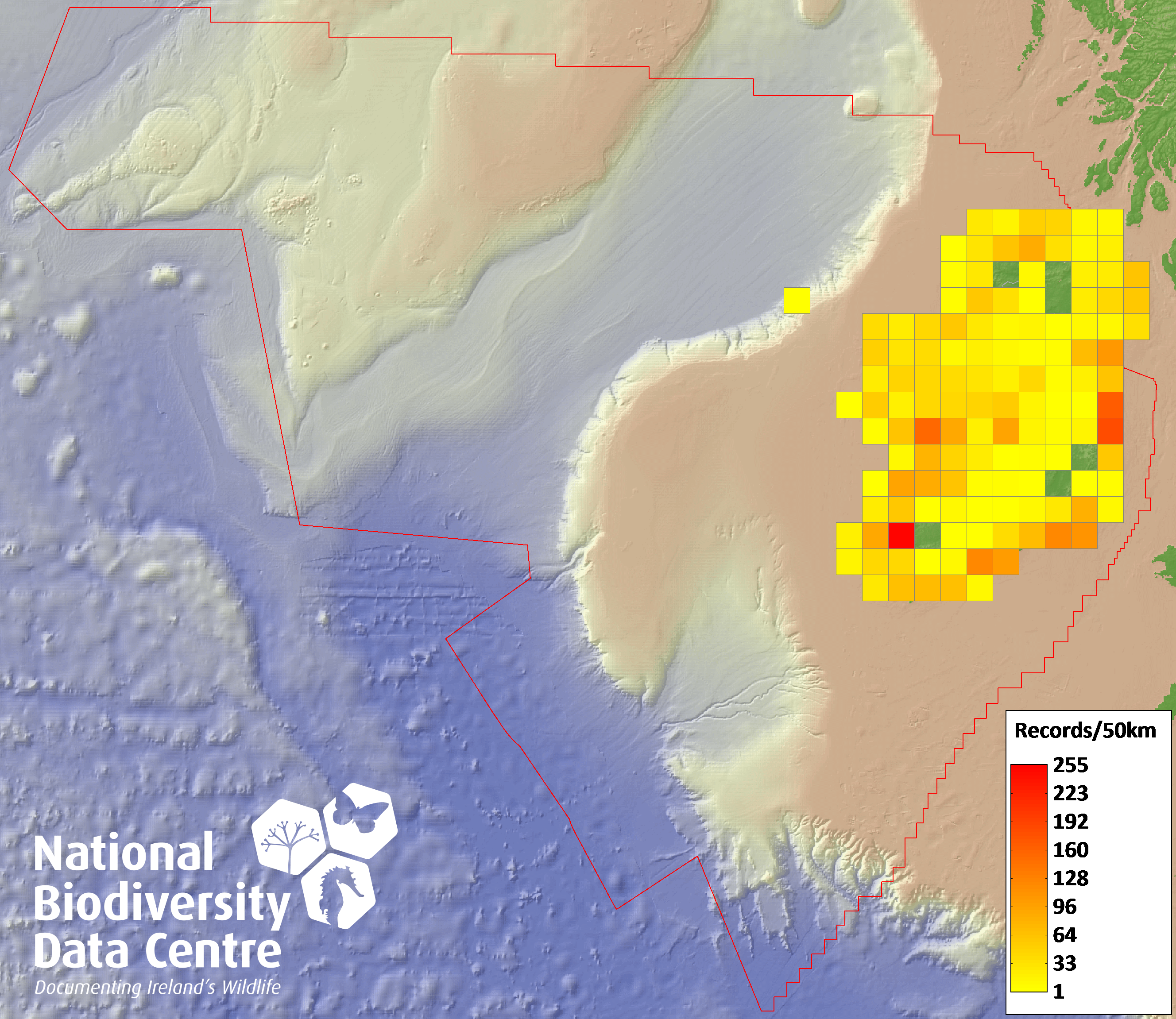 Distribution of the number of records recorded within each 10km grid square (ITM).Marine Map - 50km