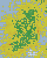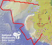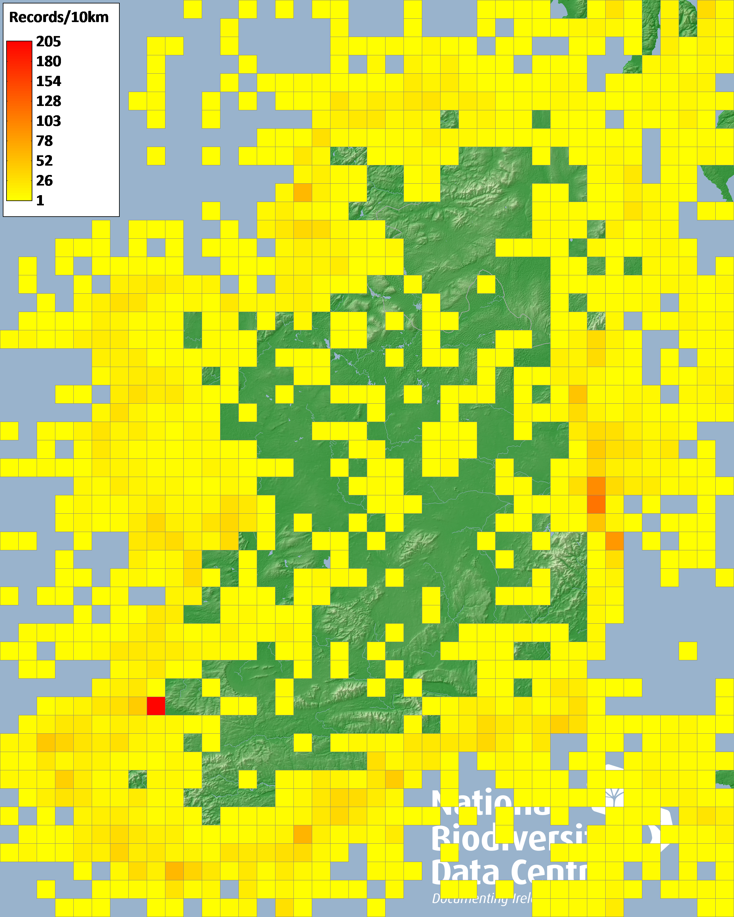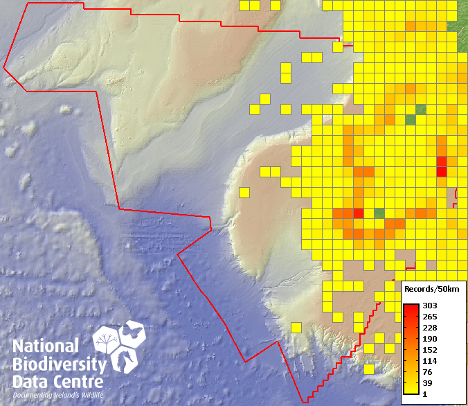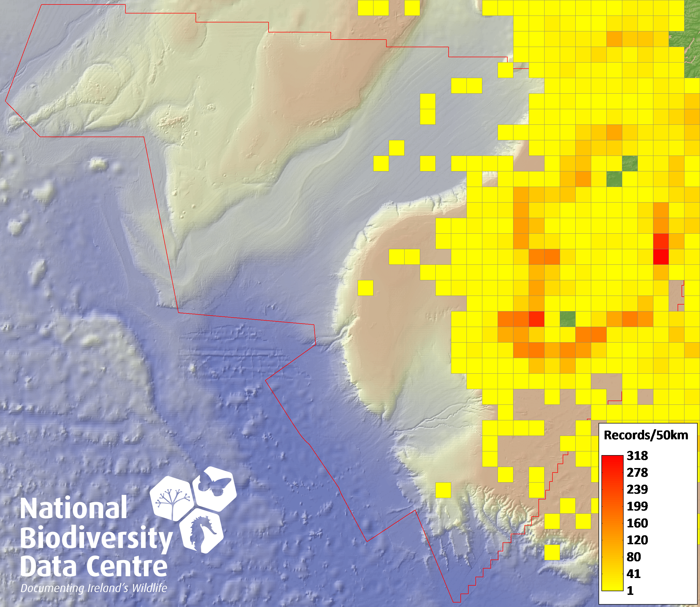 Distribution of the number of records recorded within each 10km grid square (ITM).Marine Map - 50km
