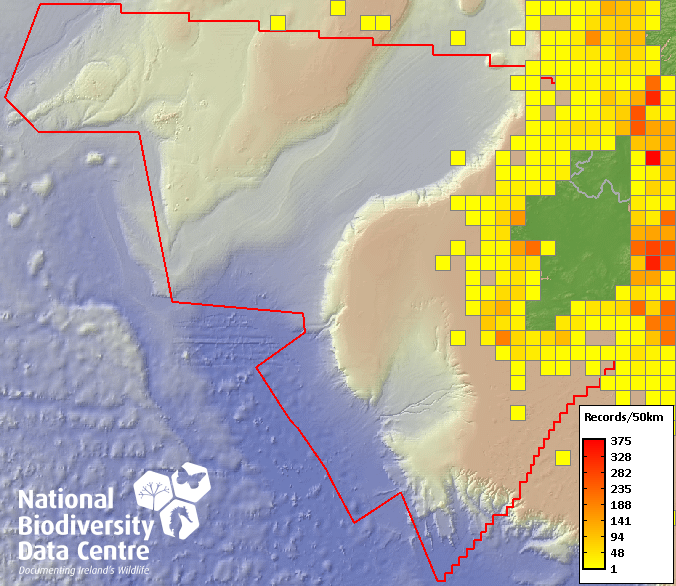 Distribution of the number of records recorded within each 10km grid square (ITM).Marine Map - 50km