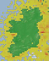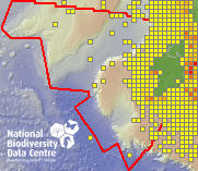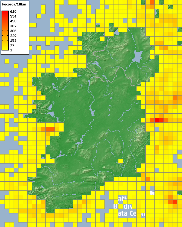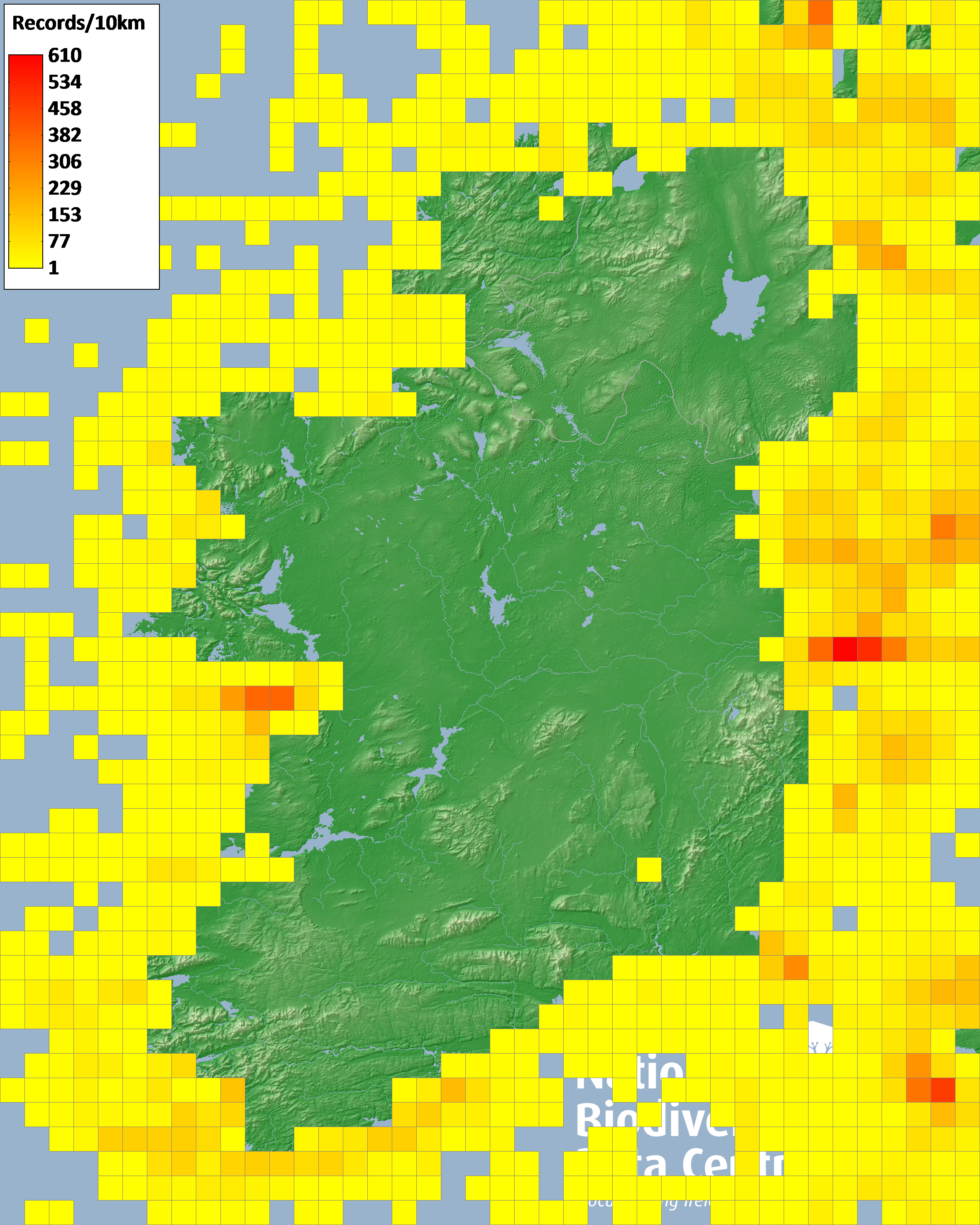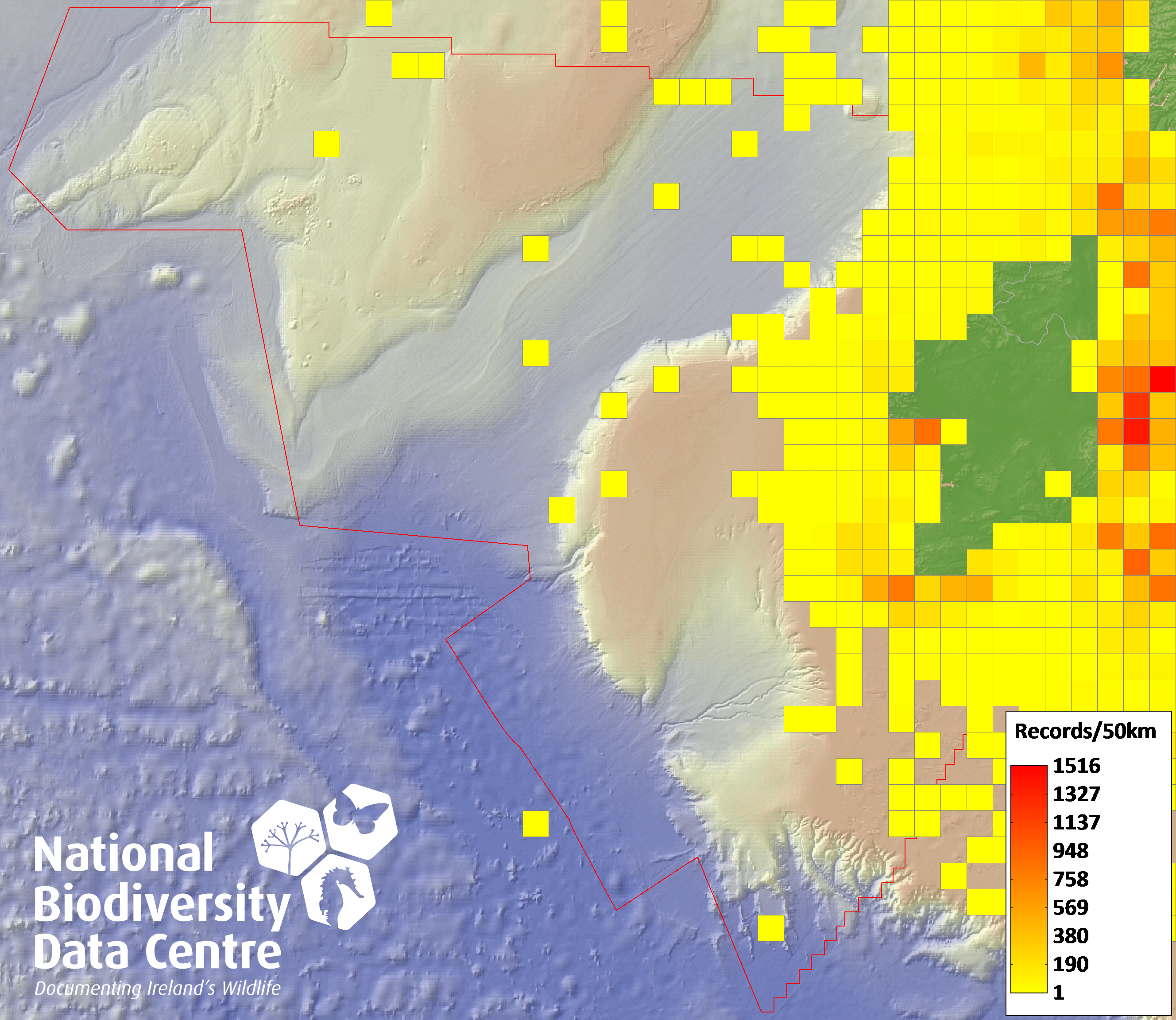 Distribution of the number of records recorded within each 10km grid square (ITM).Marine Map - 50km