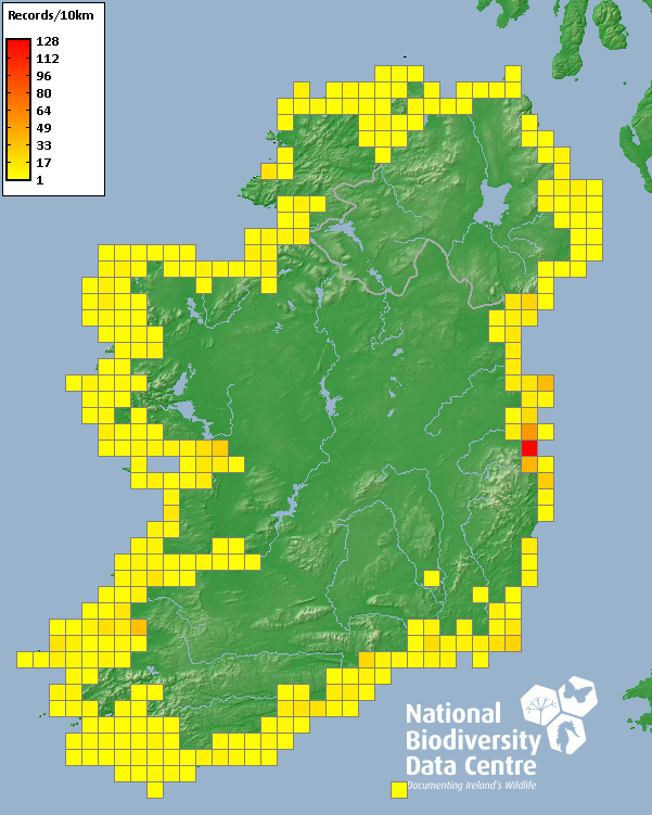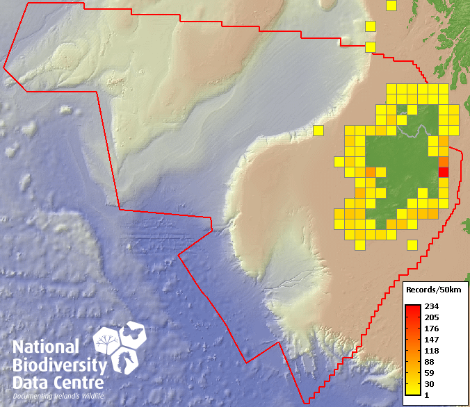 Distribution of the number of records recorded within each 10km grid square (ITM).Marine Map - 50km