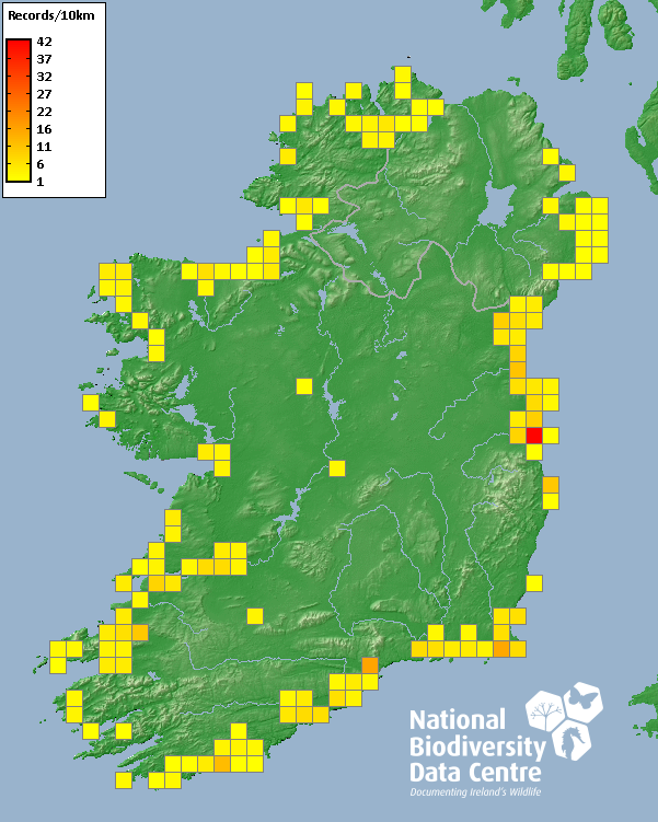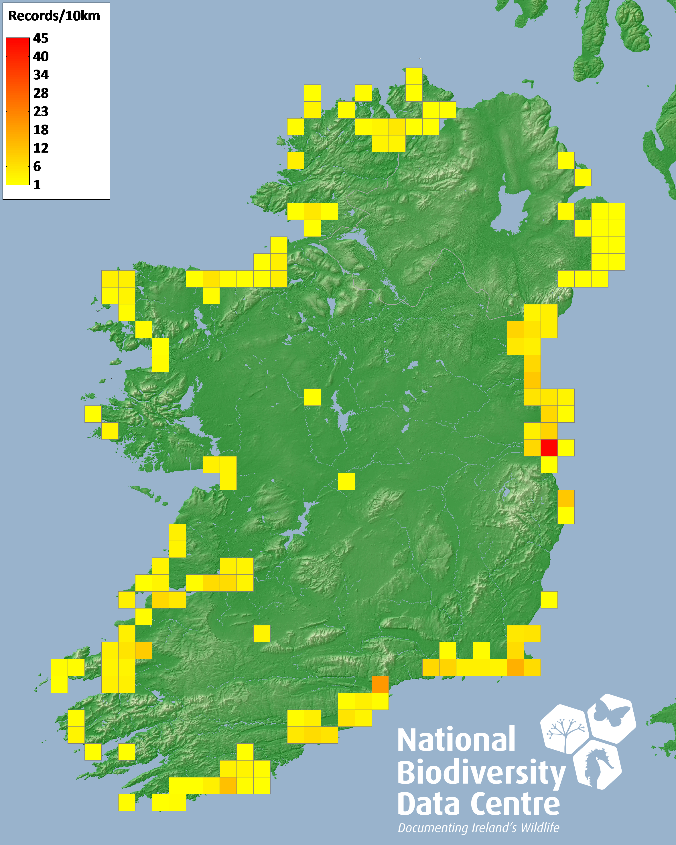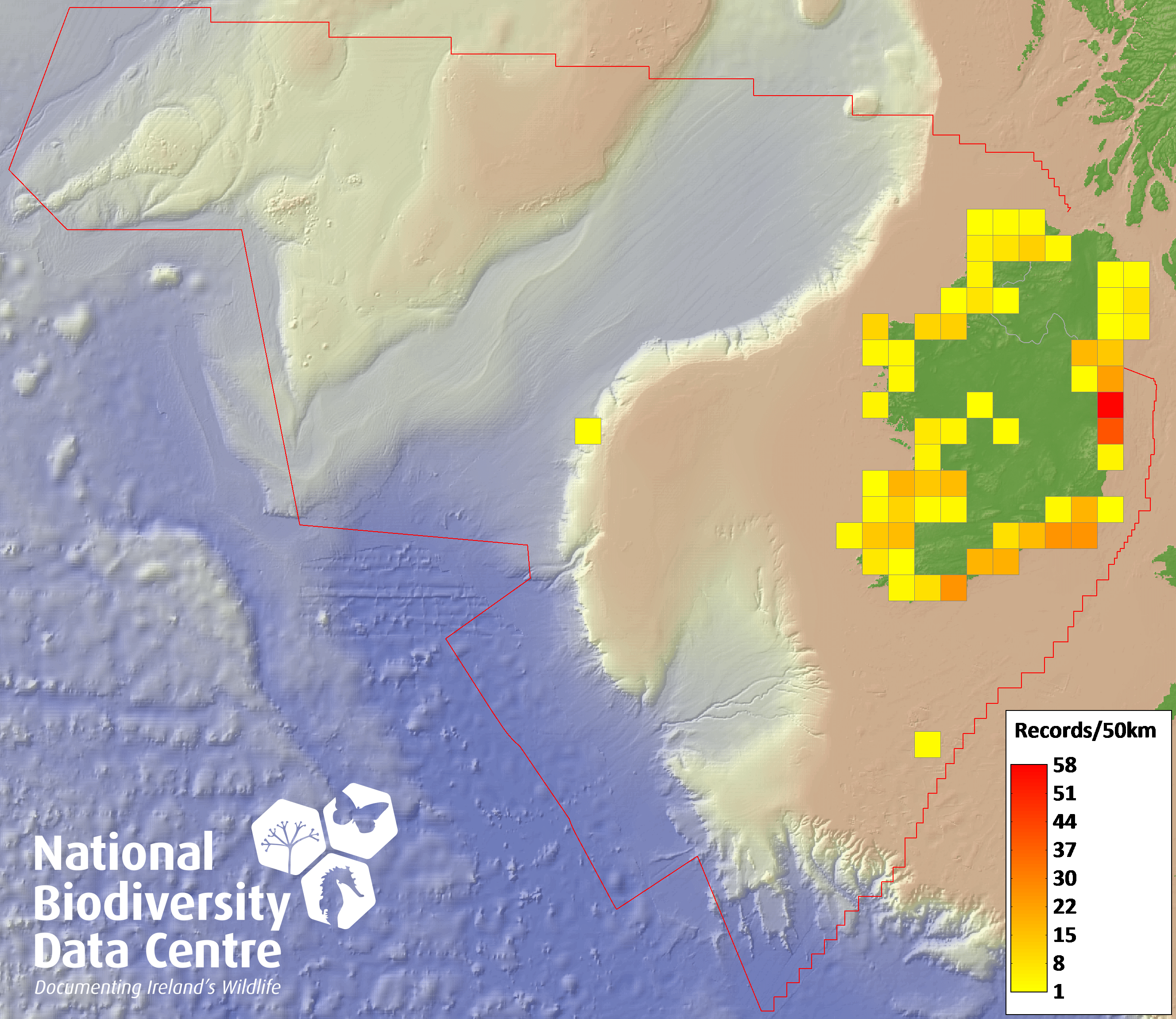 Distribution of the number of records recorded within each 10km grid square (ITM).Marine Map - 50km