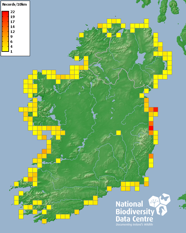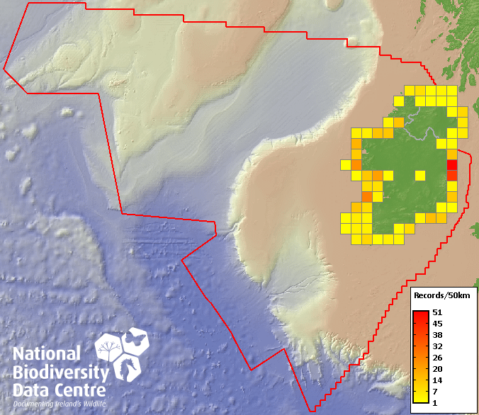 Distribution of the number of records recorded within each 10km grid square (ITM).Marine Map - 50km