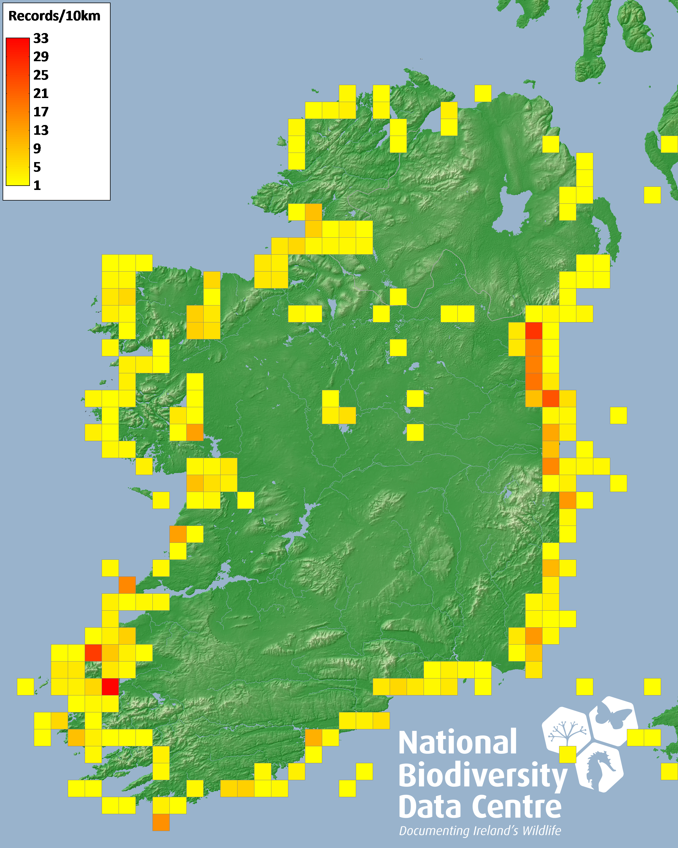 Distribution of the number of records recorded within each 10km grid square (ITM).Marine Map - 50km