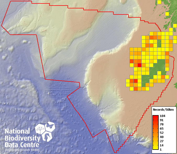 Distribution of the number of records recorded within each 10km grid square (ITM).Marine Map - 50km