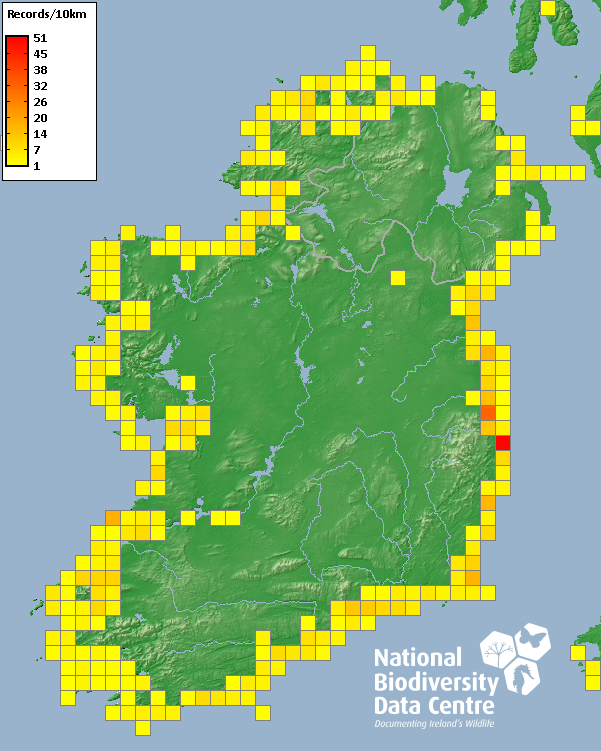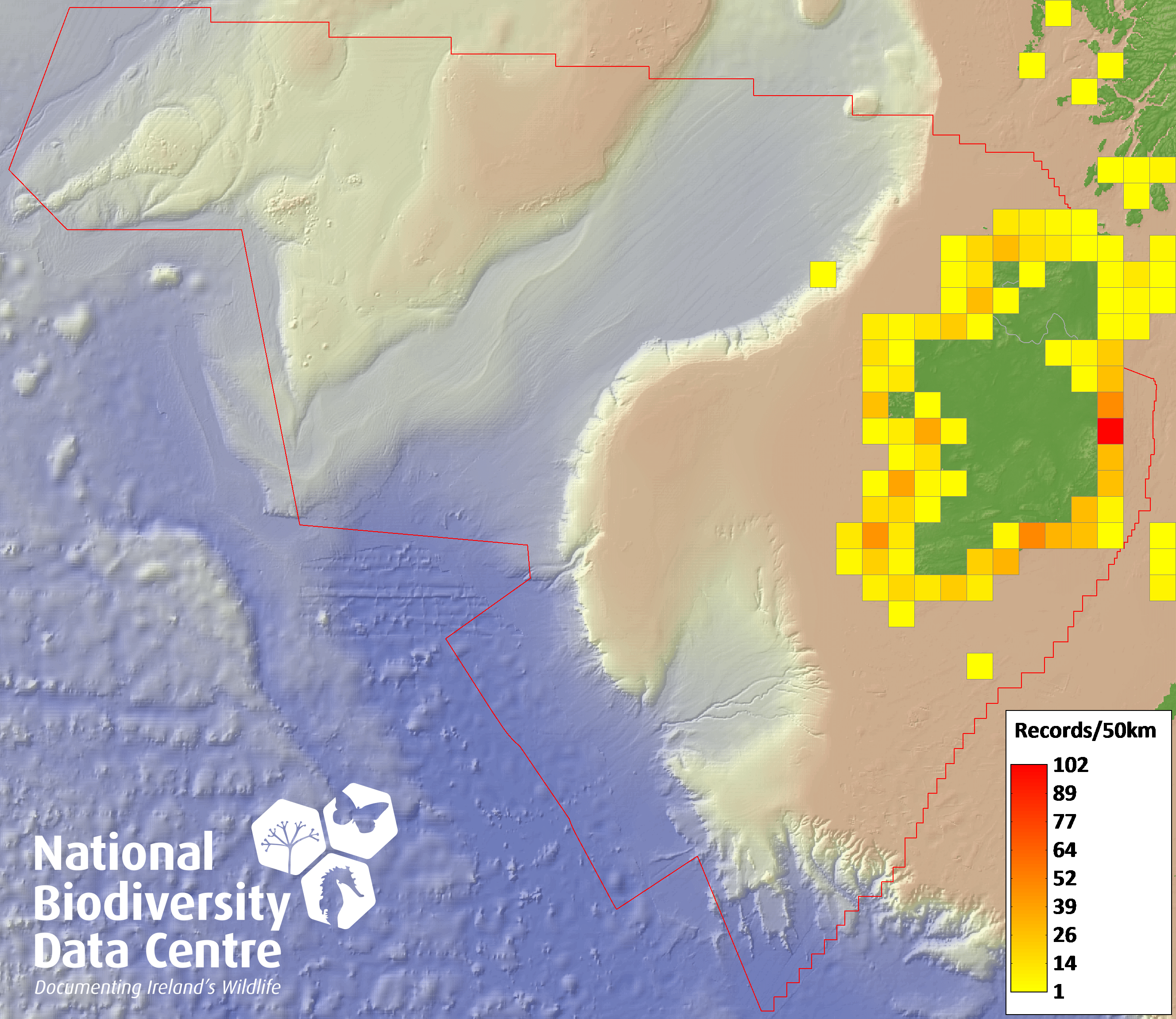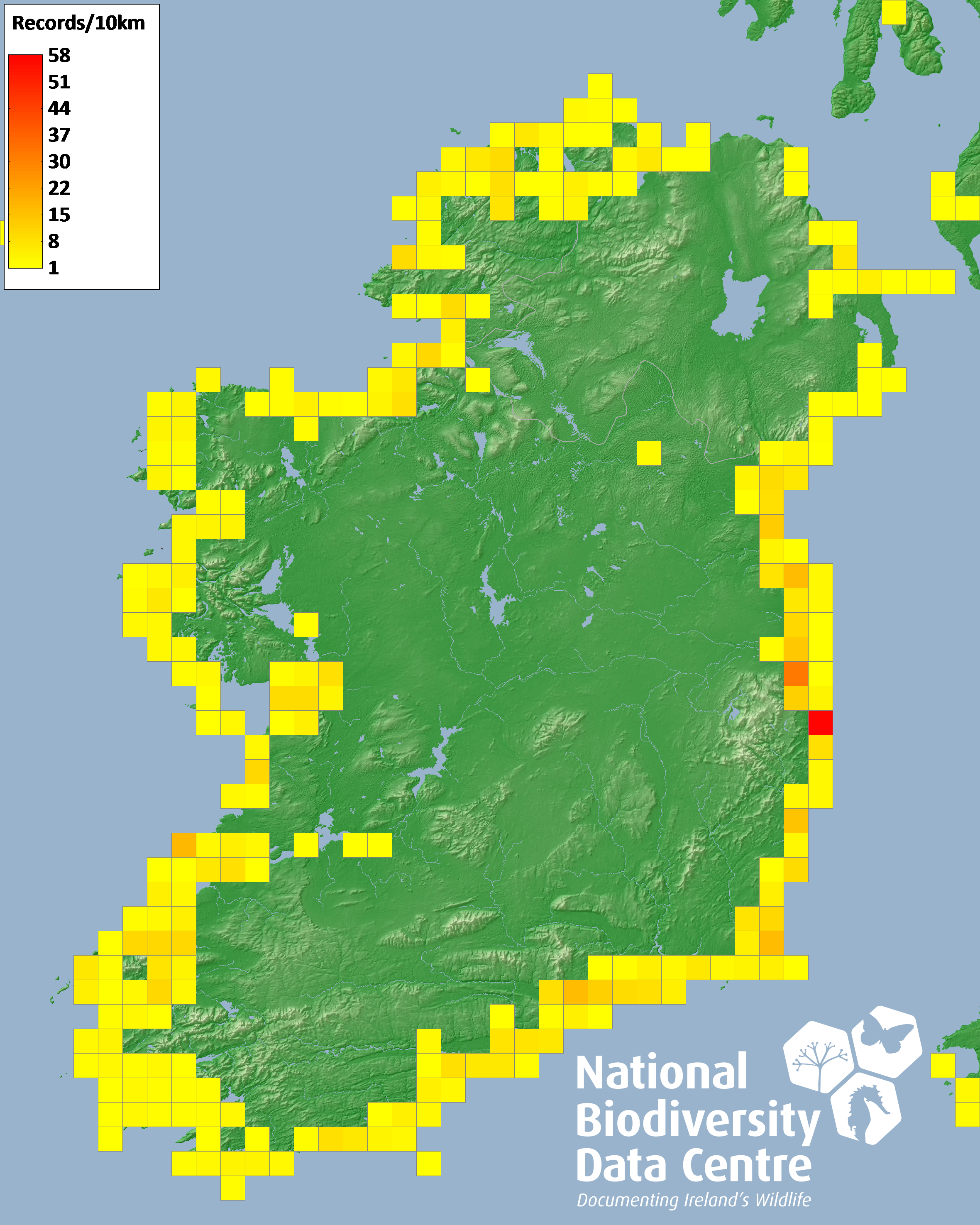 Distribution of the number of records recorded within each 10km grid square (ITM).Marine Map - 50km