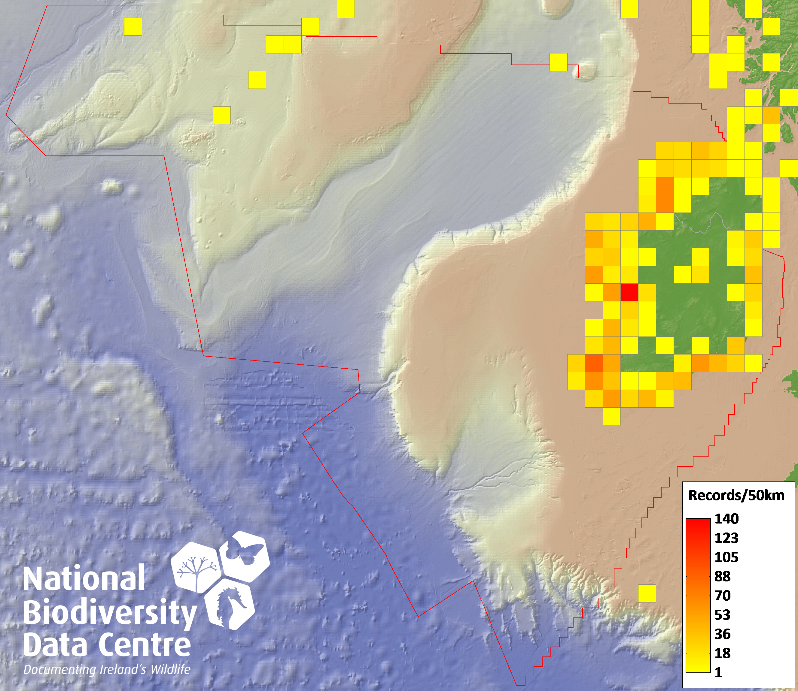 Distribution of the number of records recorded within each 10km grid square (ITM).Marine Map - 50km