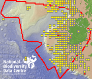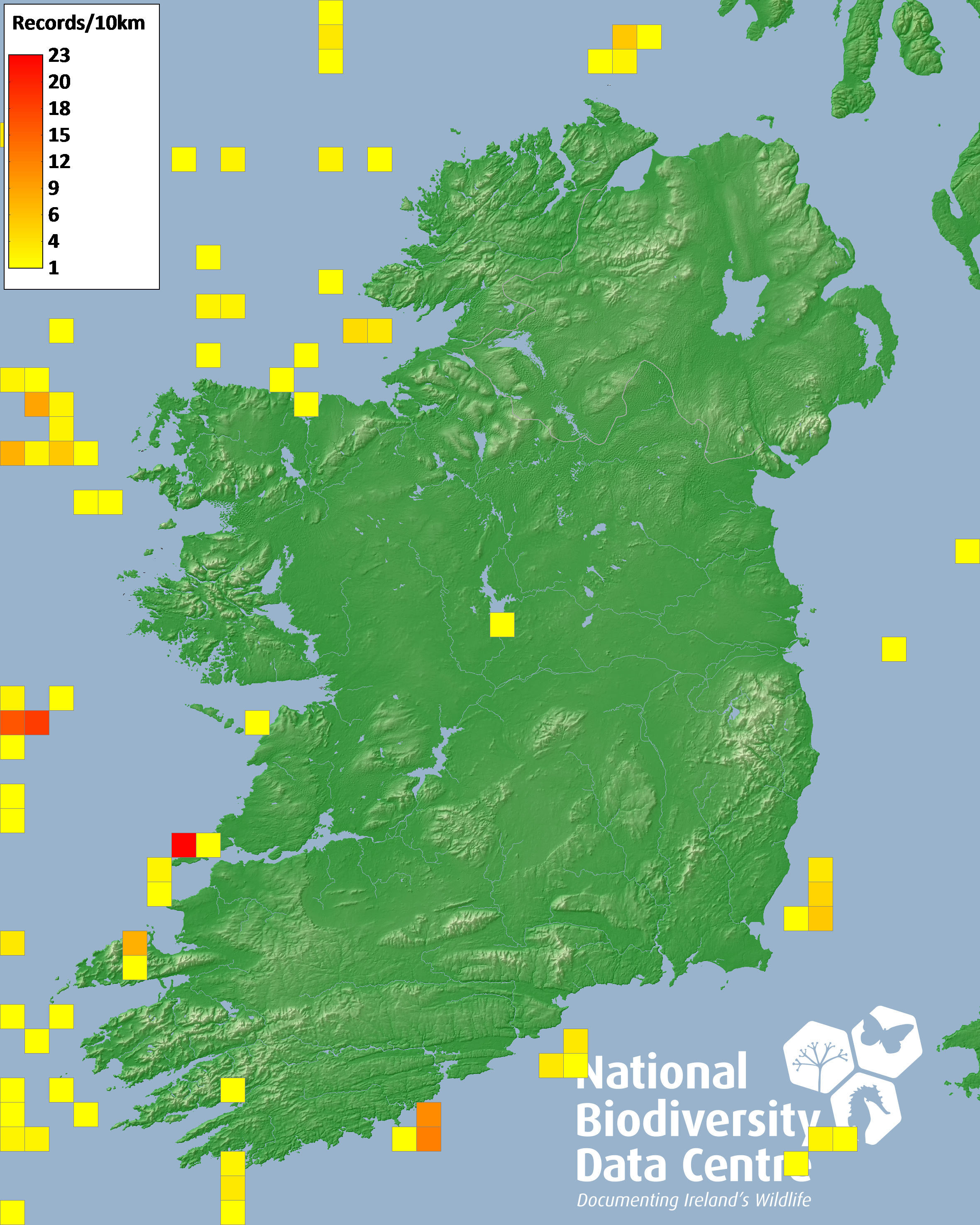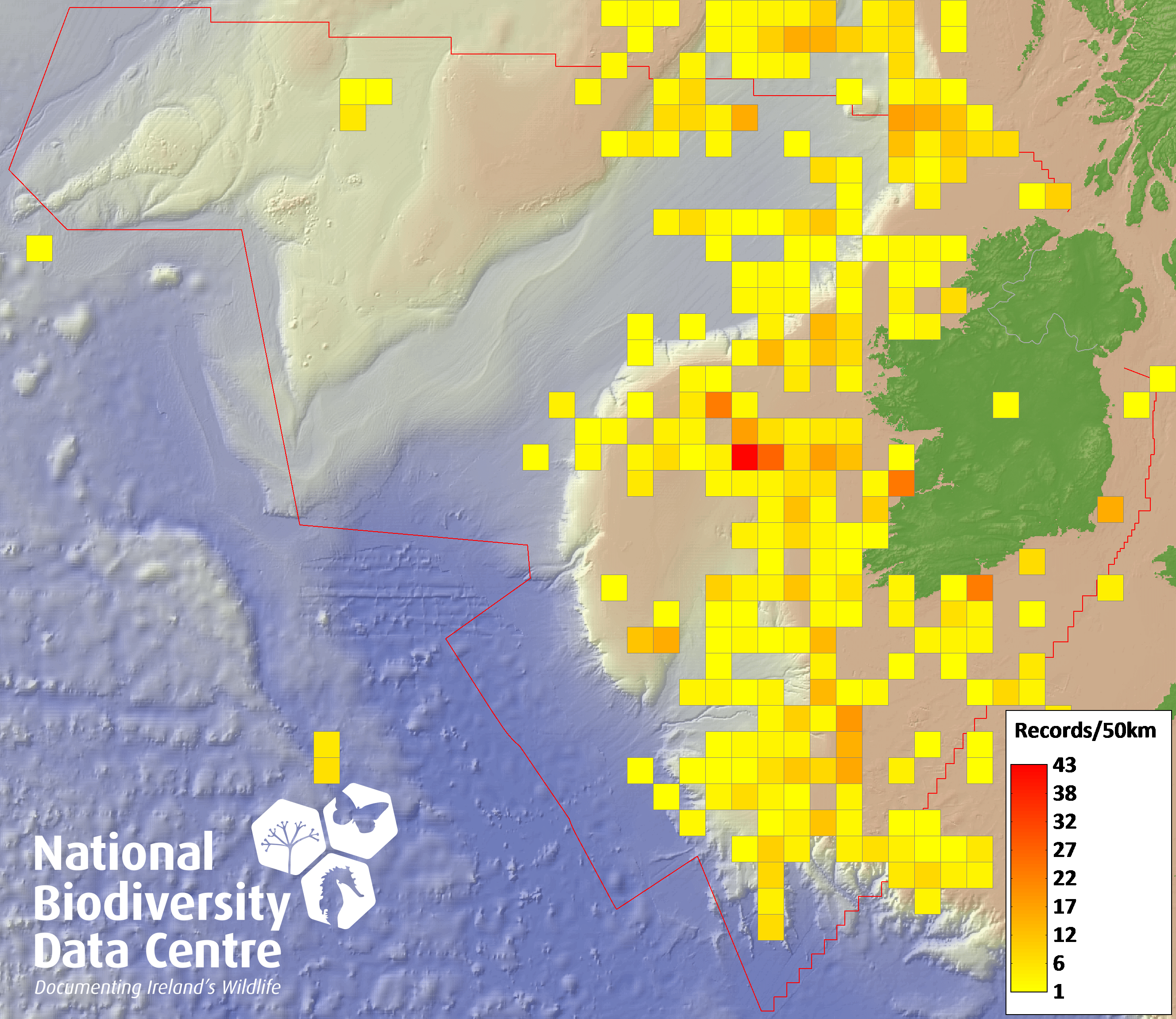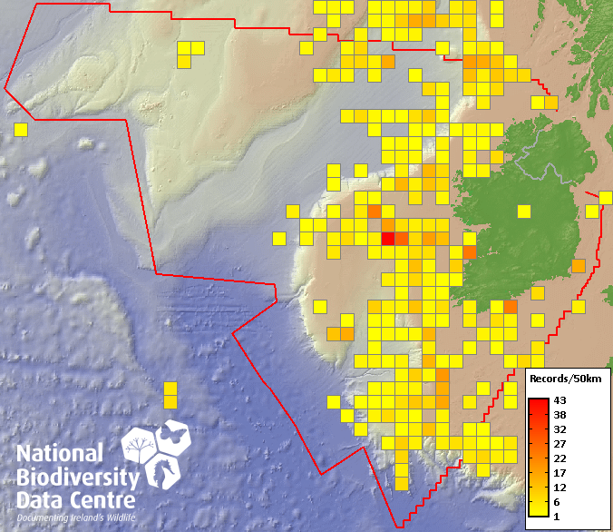 Distribution of the number of records recorded within each 10km grid square (ITM).Marine Map - 50km
