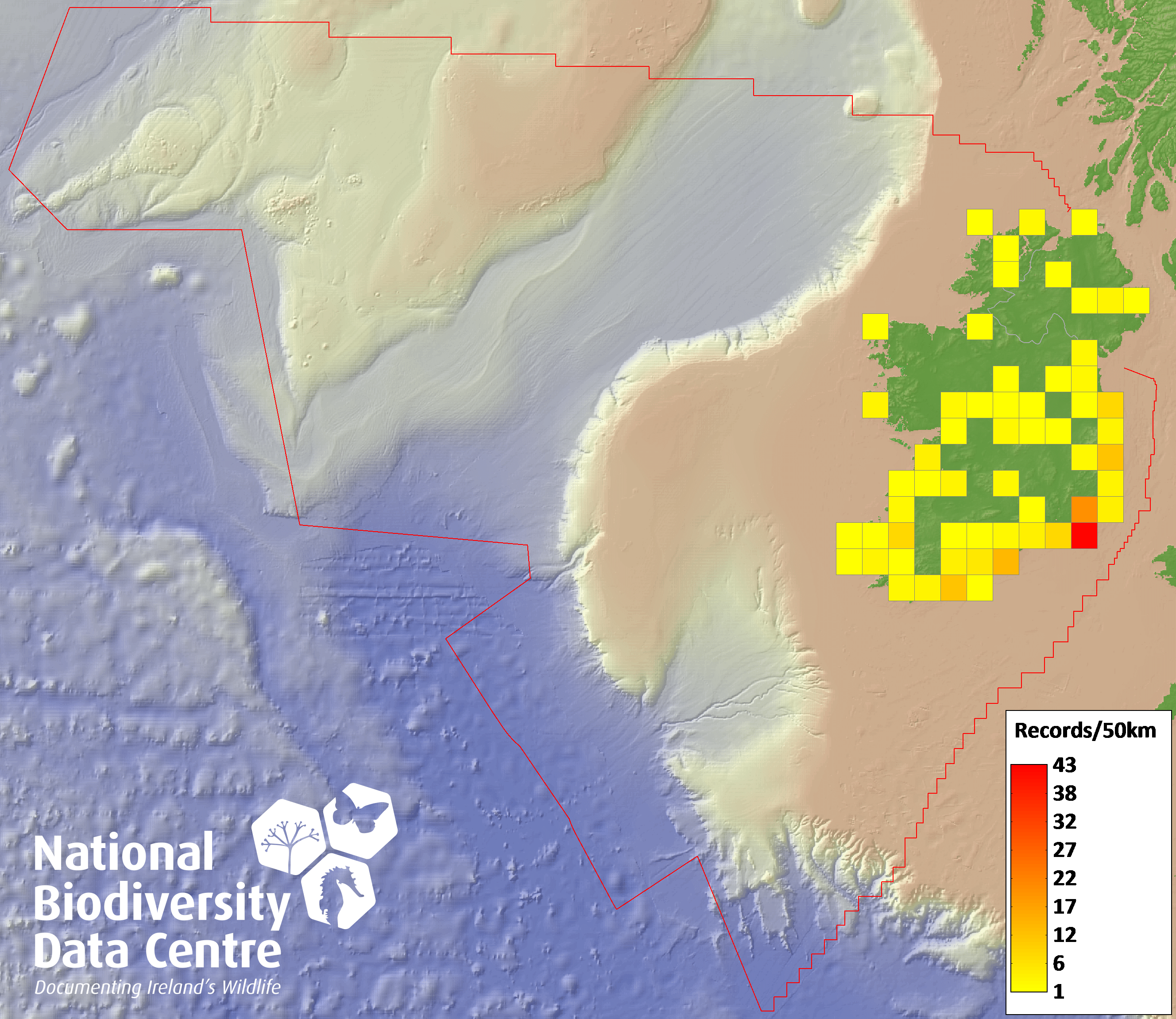 Distribution of the number of records recorded within each 10km grid square (ITM).Marine Map - 50km