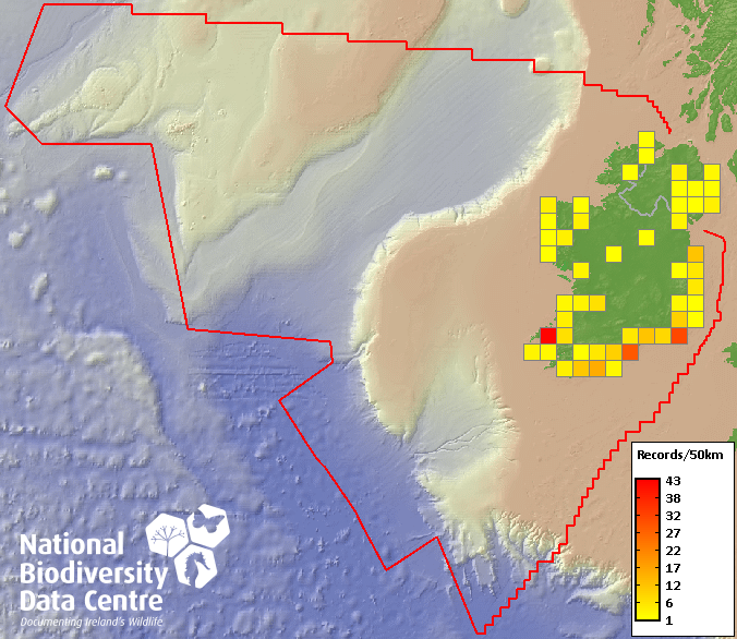 Distribution of the number of records recorded within each 10km grid square (ITM).Marine Map - 50km