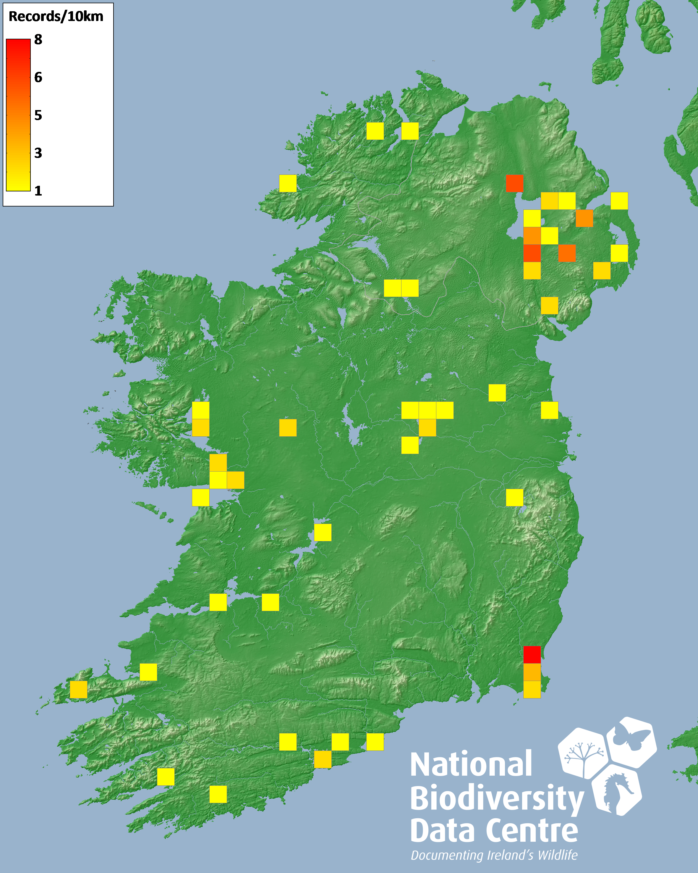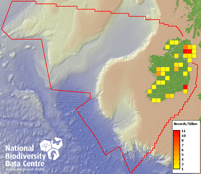 Distribution of the number of records recorded within each 10km grid square (ITM).Marine Map - 50km