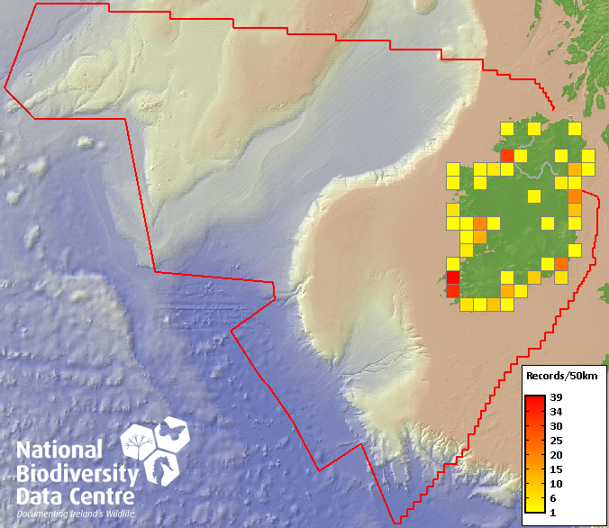 Distribution of the number of records recorded within each 10km grid square (ITM).Marine Map - 50km