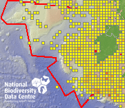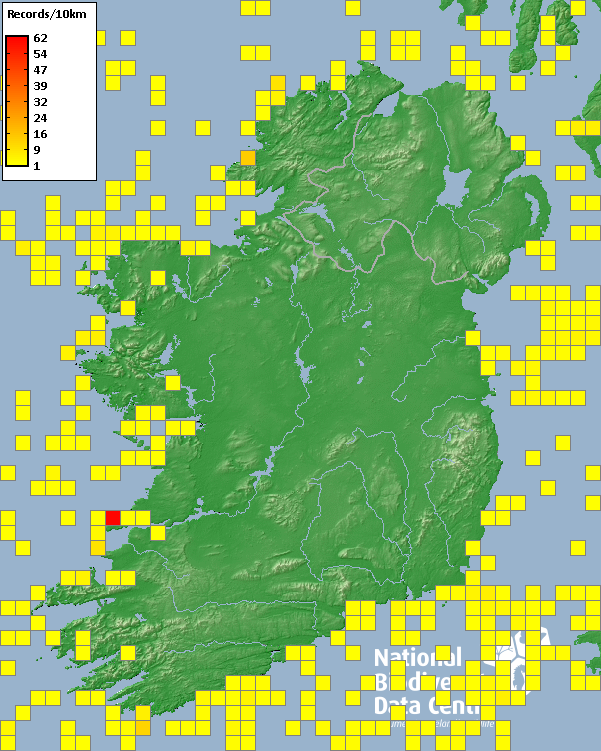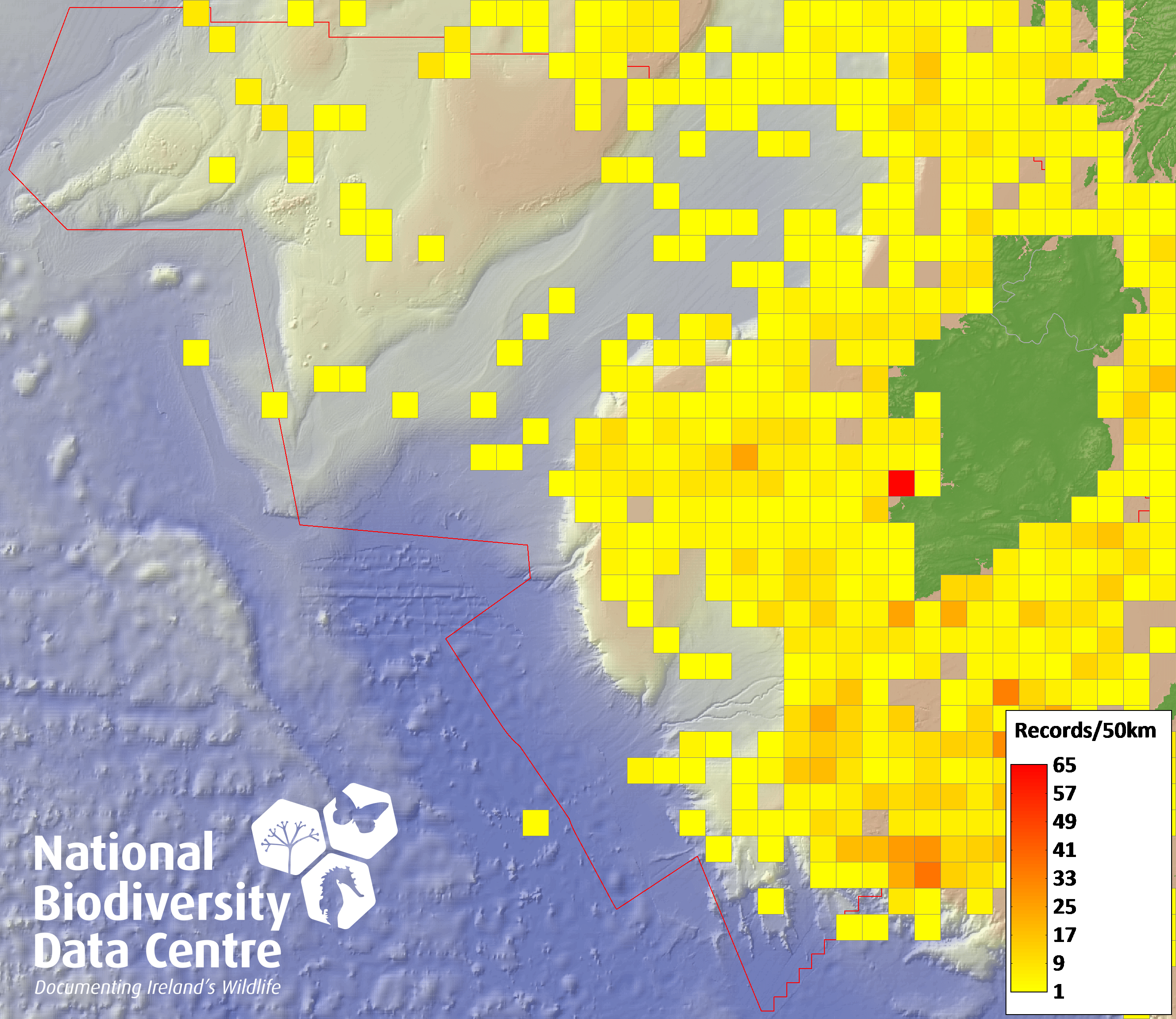 Distribution of the number of records recorded within each 10km grid square (ITM).Marine Map - 50km
