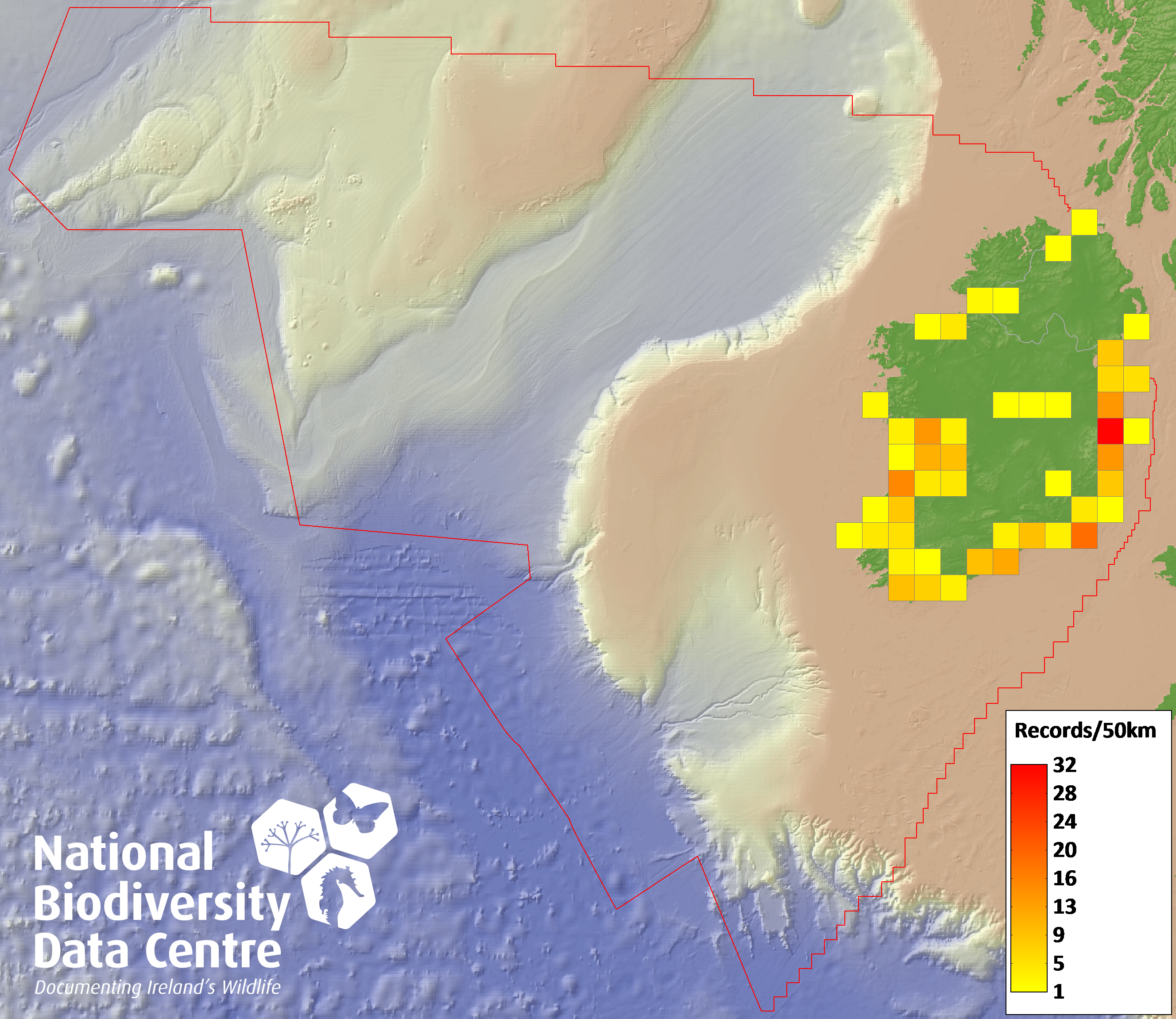 Distribution of the number of records recorded within each 10km grid square (ITM).Marine Map - 50km