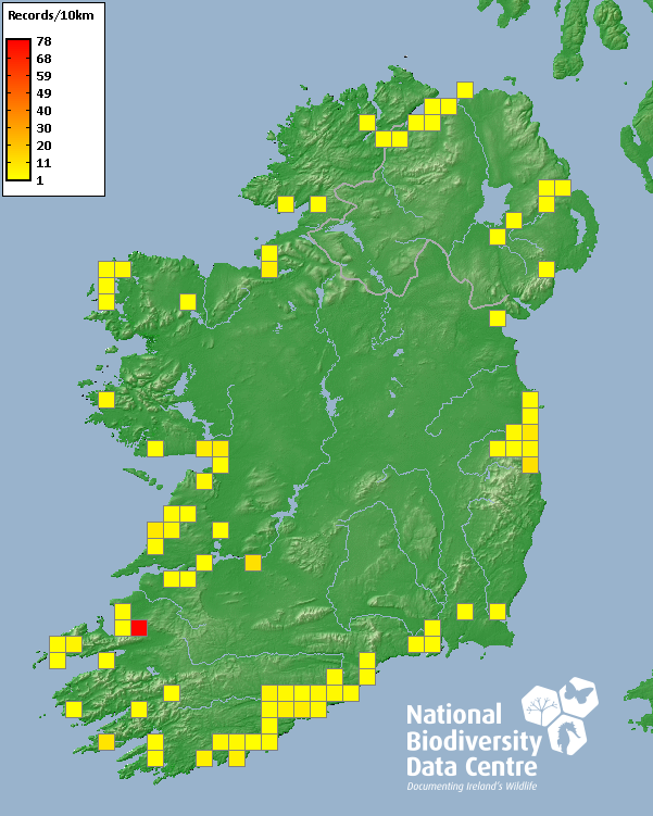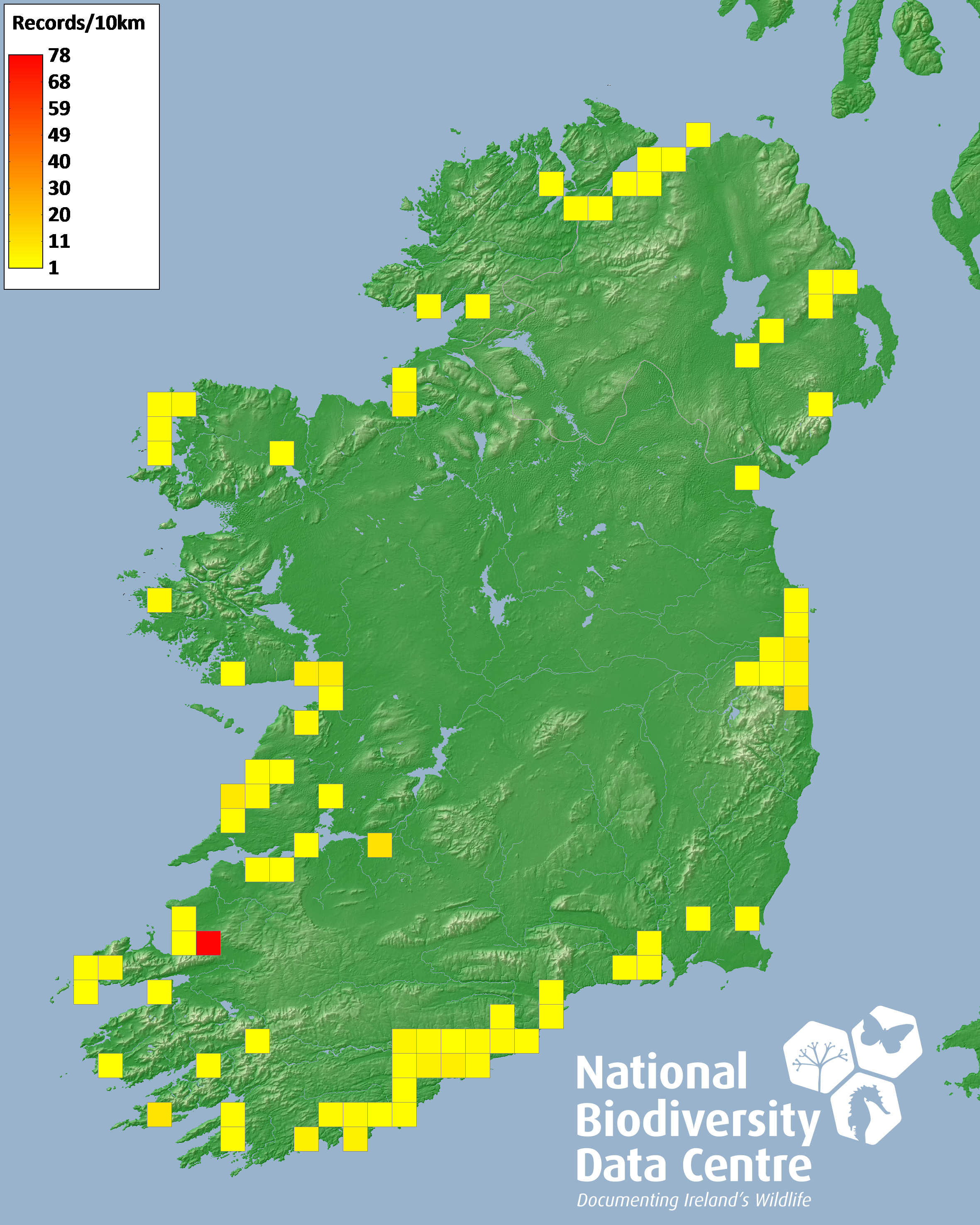 Distribution of the number of records recorded within each 10km grid square (ITM).Marine Map - 50km