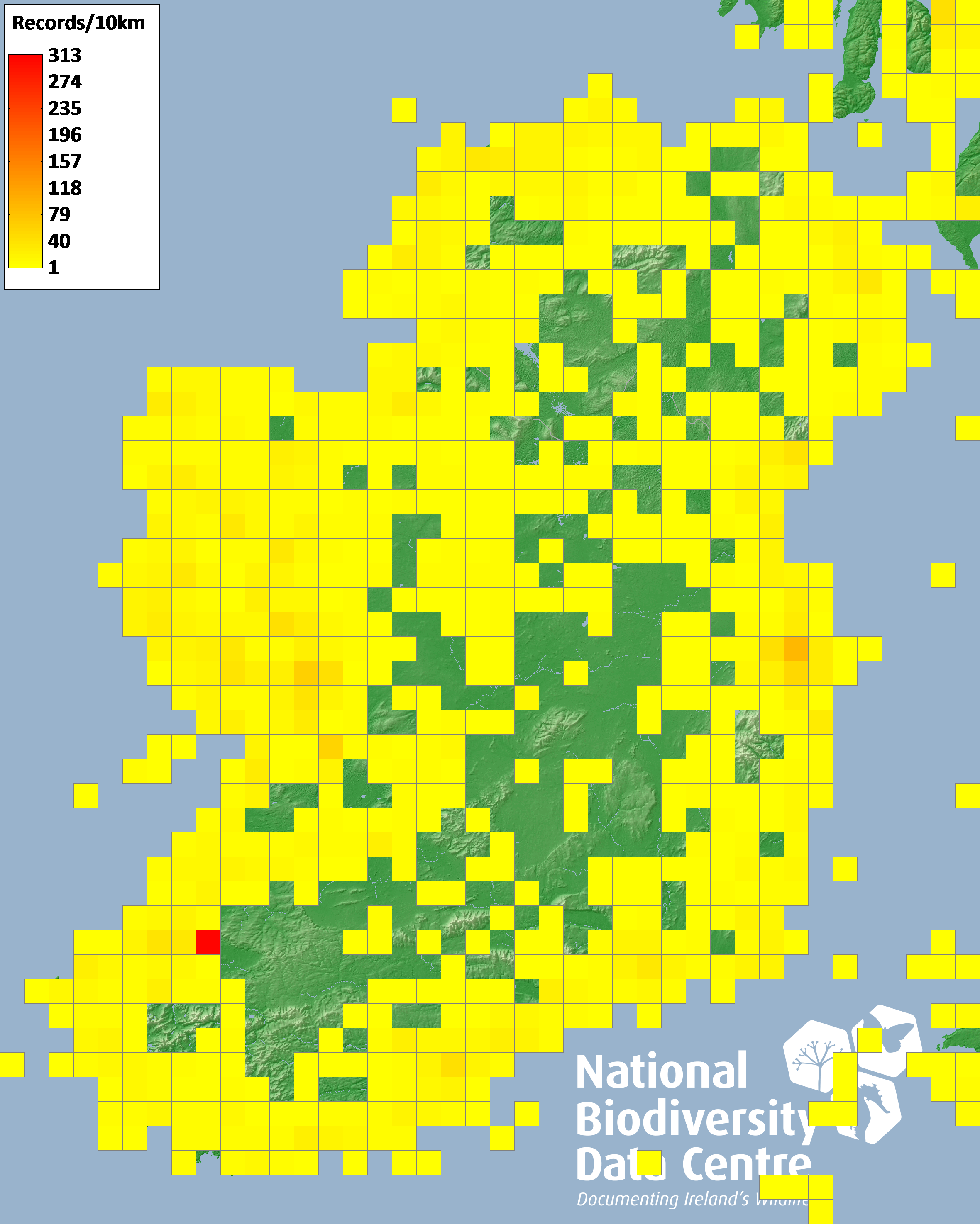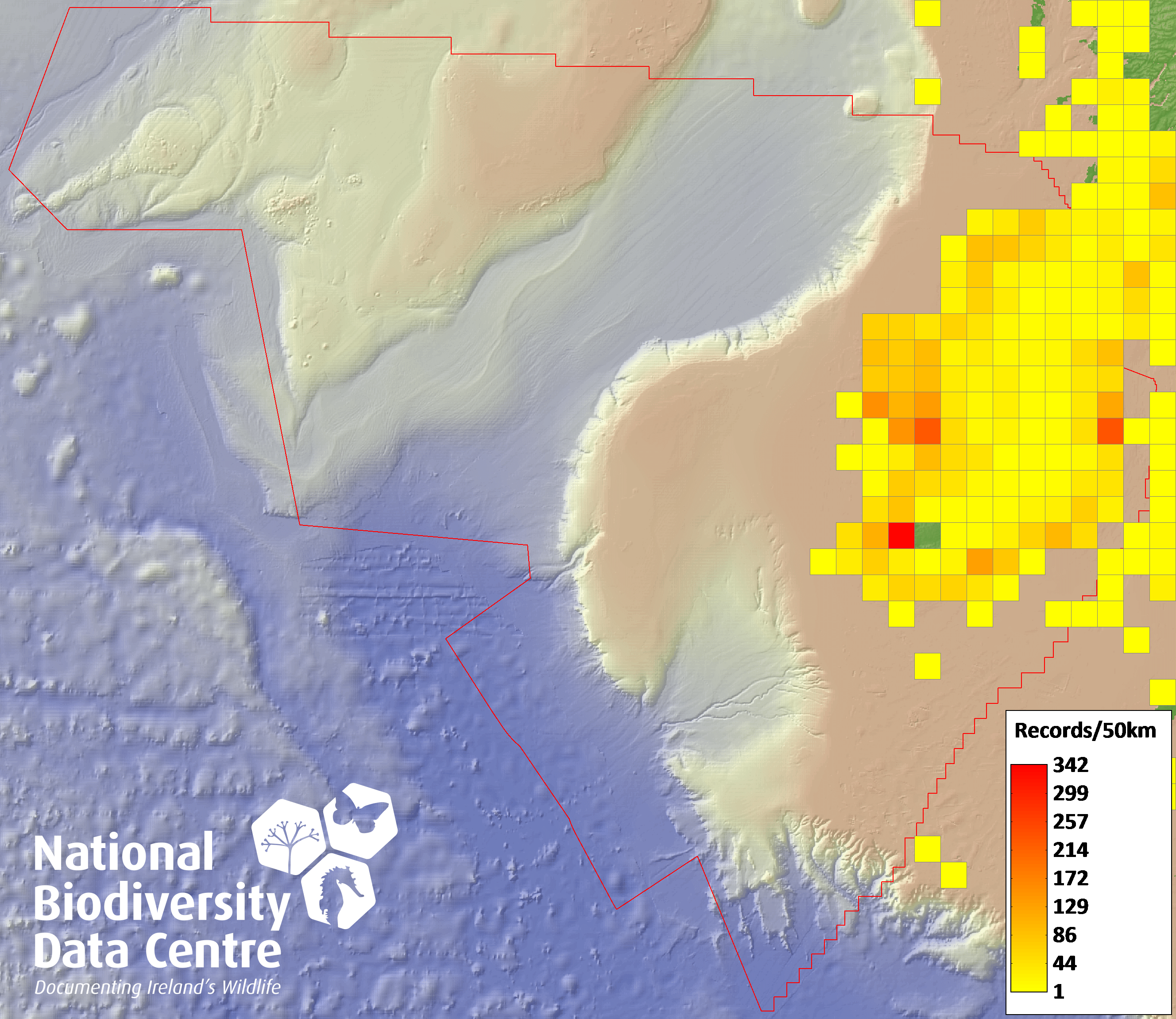 Distribution of the number of records recorded within each 10km grid square (ITM).Marine Map - 50km