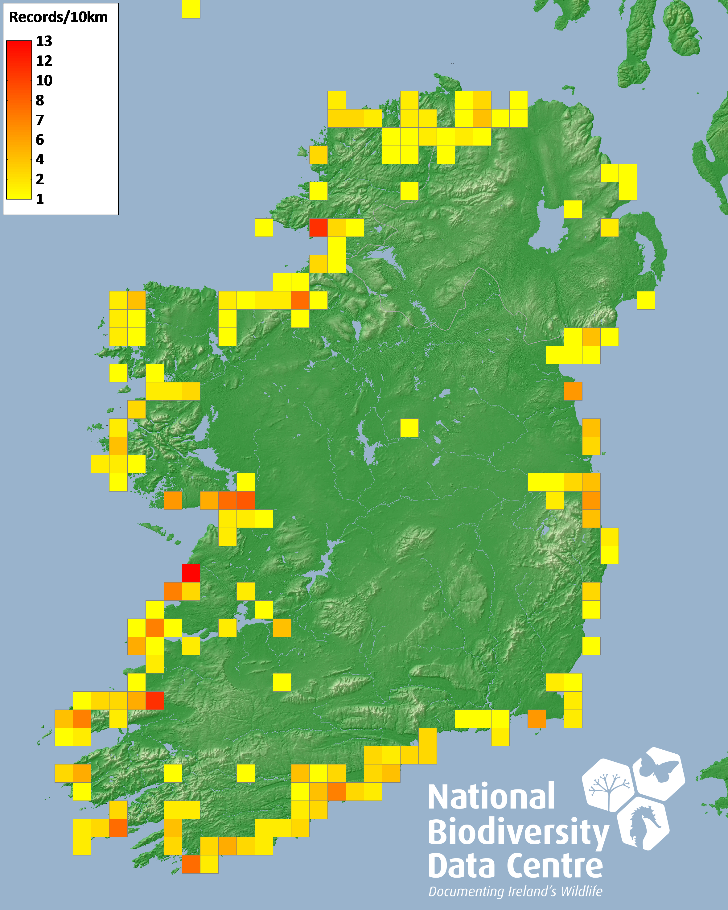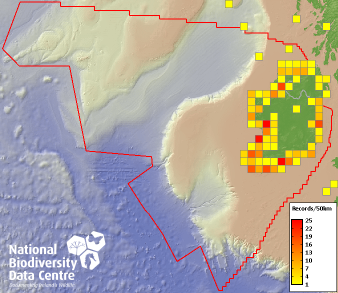 Distribution of the number of records recorded within each 10km grid square (ITM).Marine Map - 50km