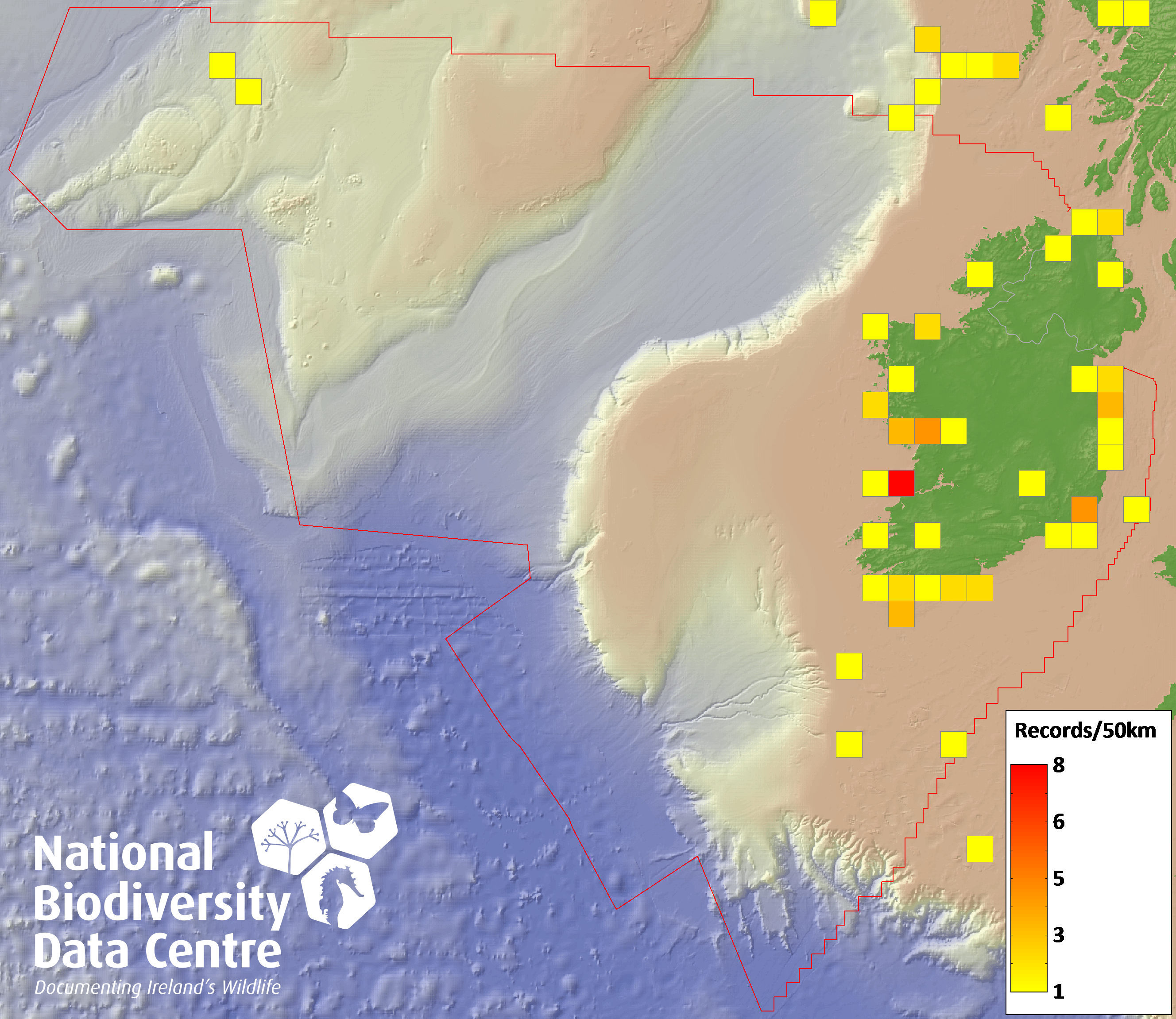 Distribution of the number of records recorded within each 10km grid square (ITM).Marine Map - 50km