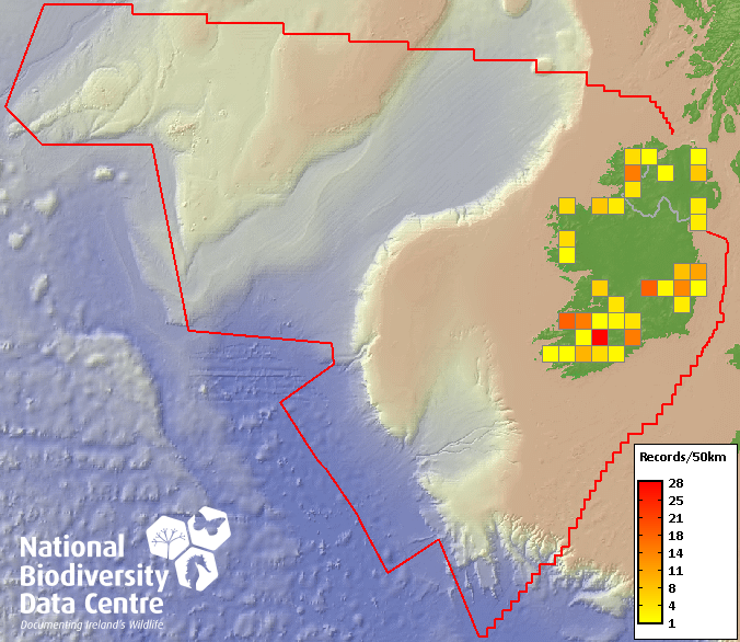 Distribution of the number of records recorded within each 10km grid square (ITM).Marine Map - 50km