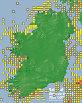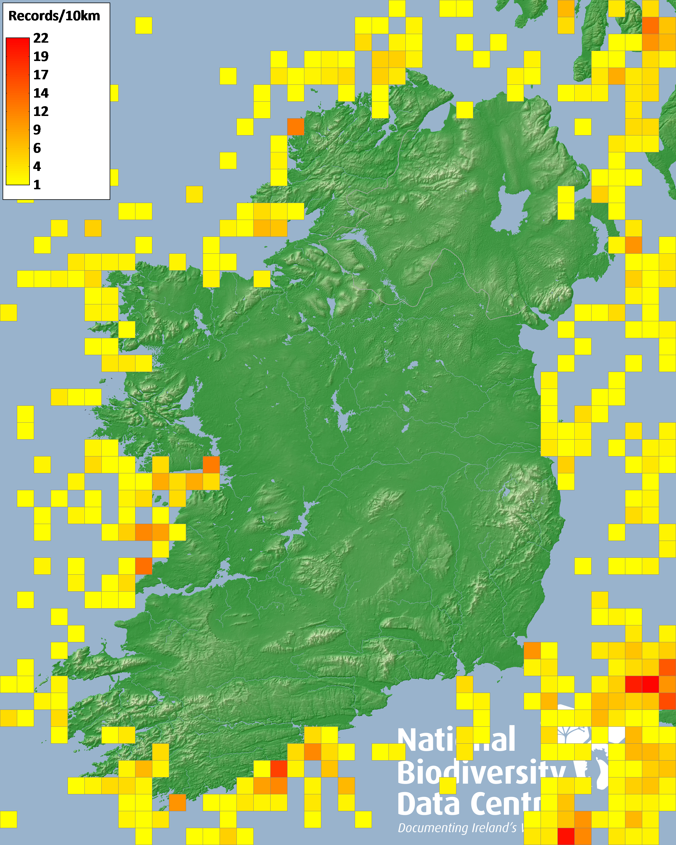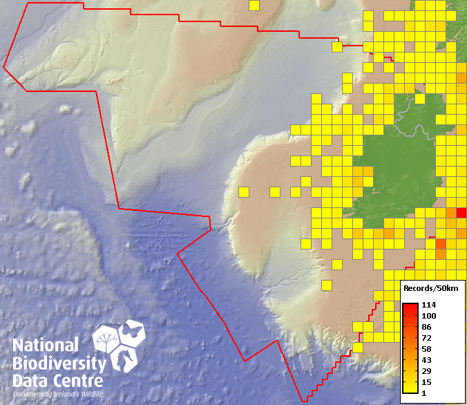 Distribution of the number of records recorded within each 10km grid square (ITM).Marine Map - 50km