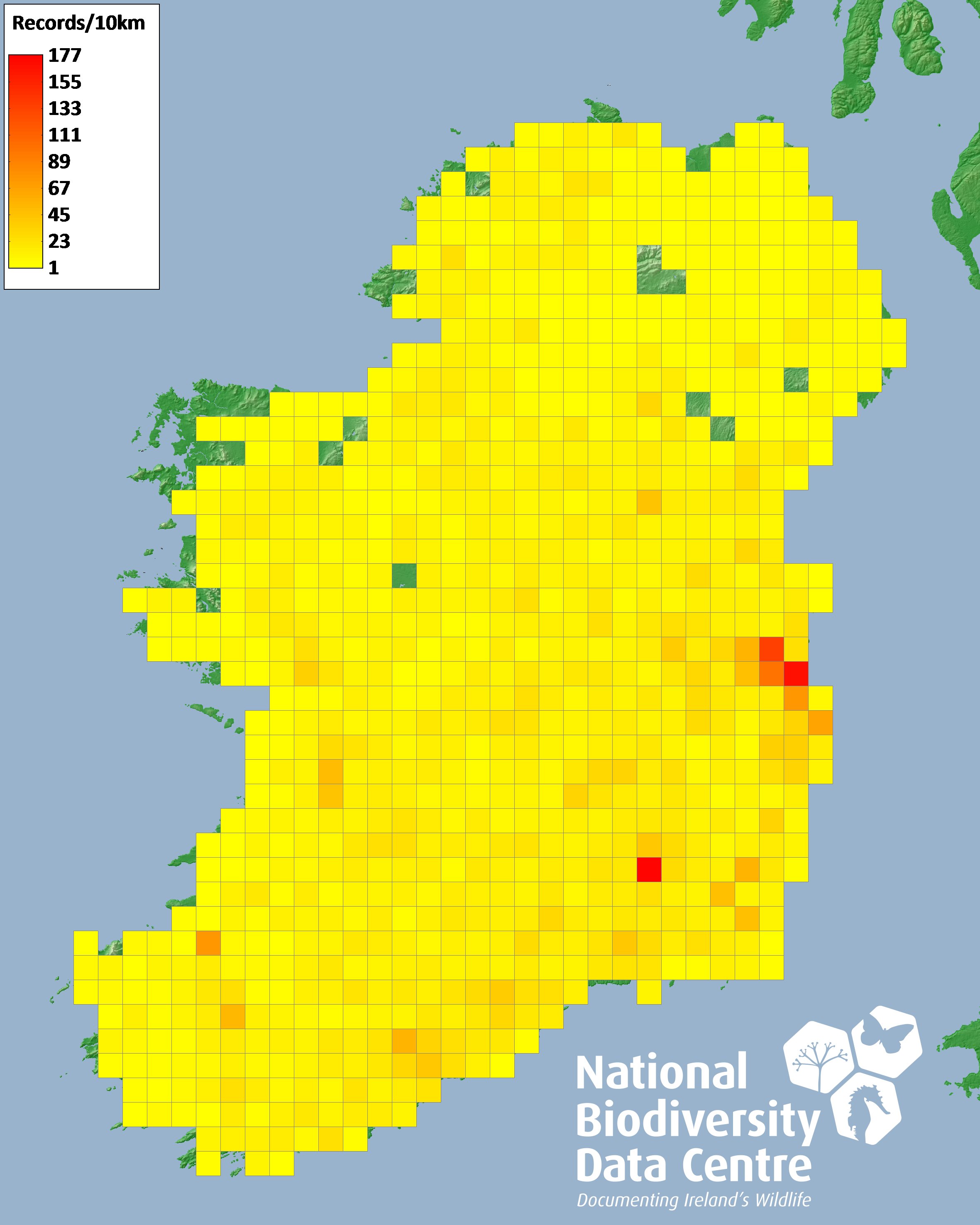 Distribution of the number of records recorded within each 10km grid square (ITM).Marine Map - 50km