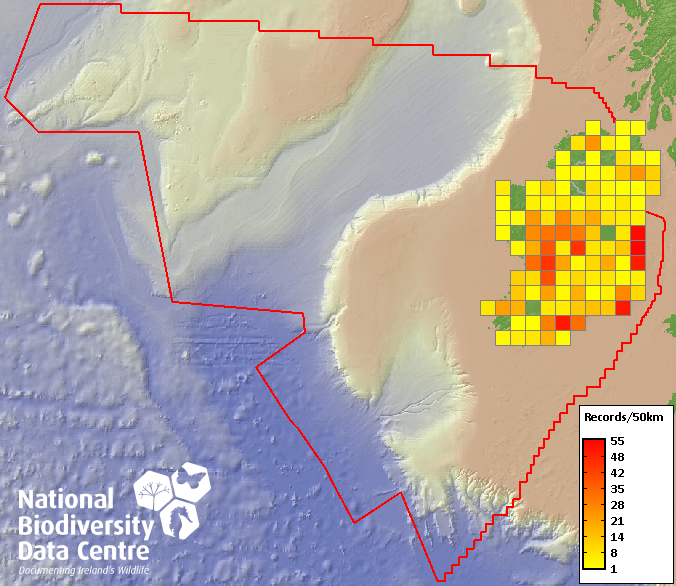 Distribution of the number of records recorded within each 10km grid square (ITM).Marine Map - 50km