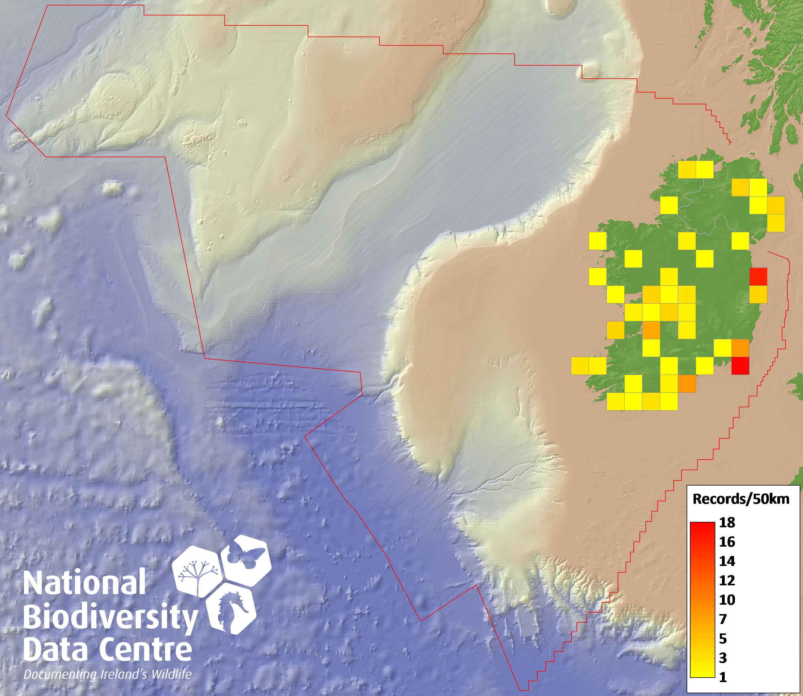 Distribution of the number of records recorded within each 10km grid square (ITM).Marine Map - 50km
