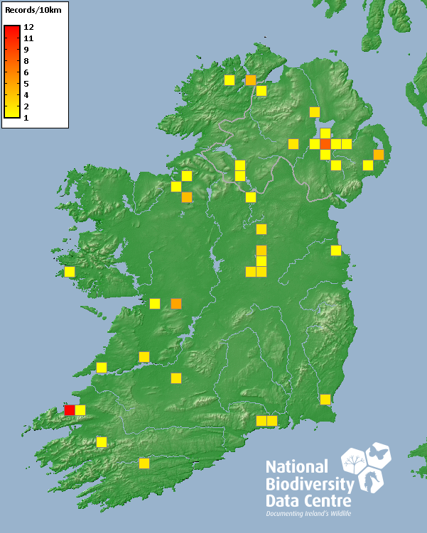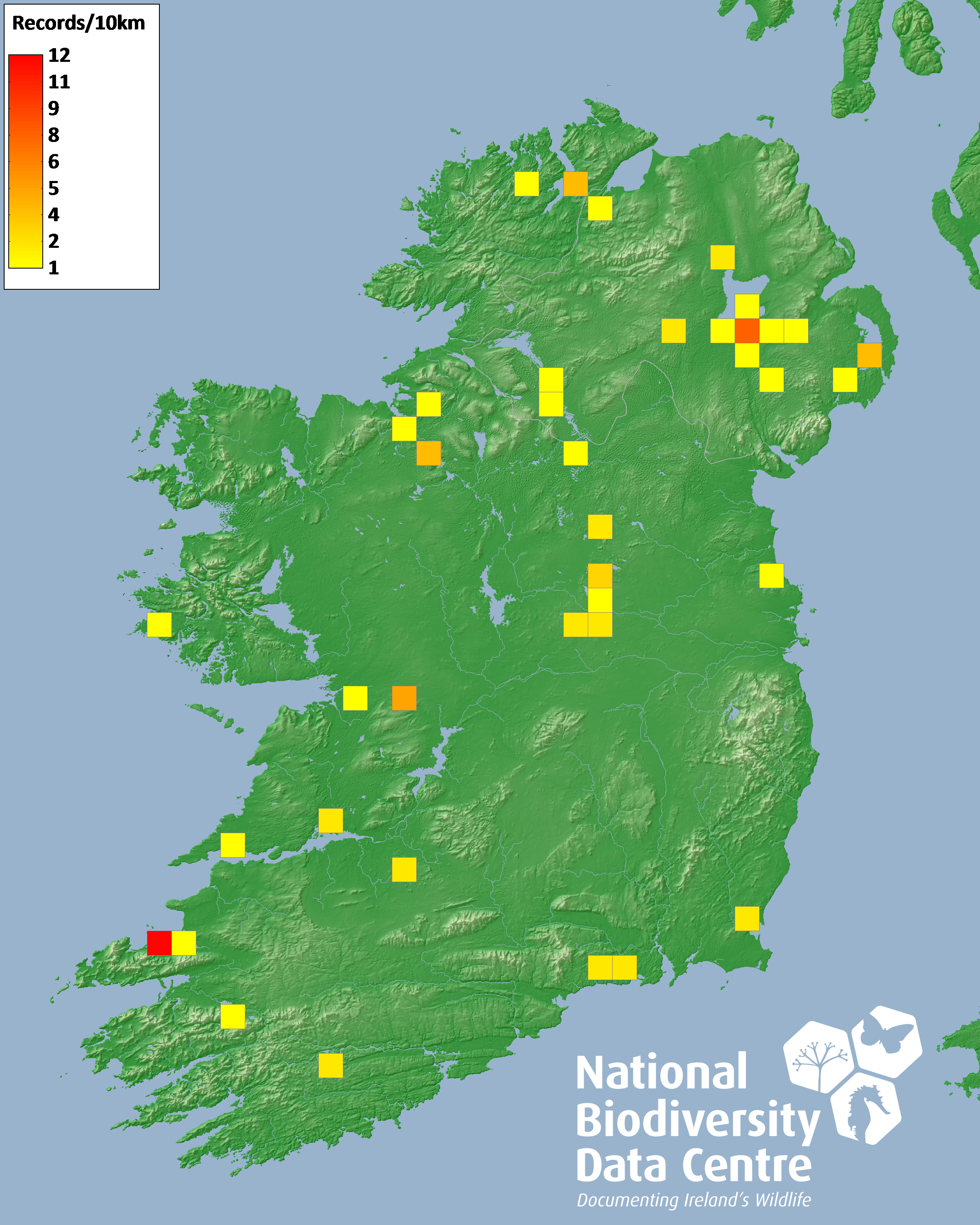 Distribution of the number of records recorded within each 10km grid square (ITM).Marine Map - 50km