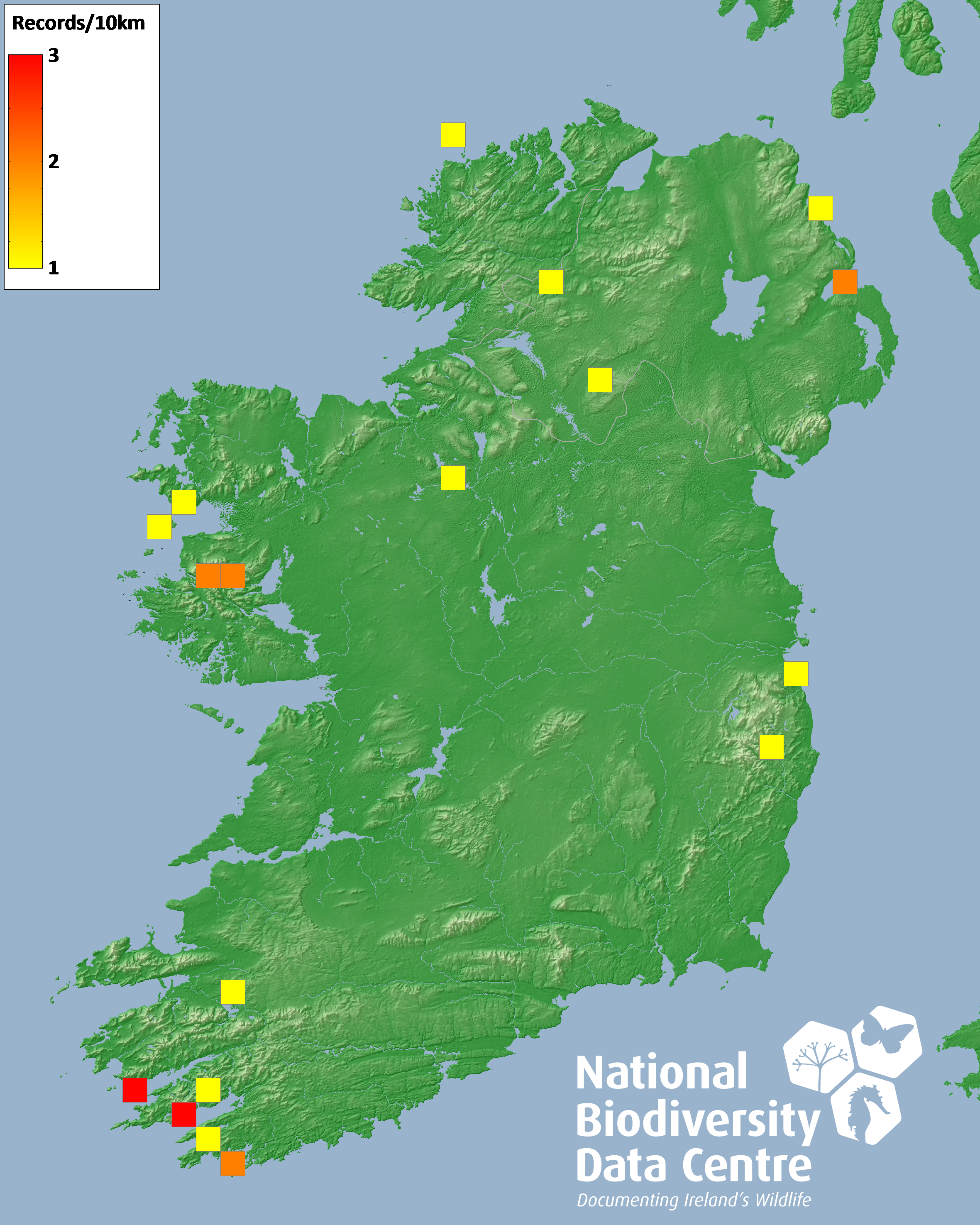 Distribution of the number of records recorded within each 10km grid square (ITM).Marine Map - 50km