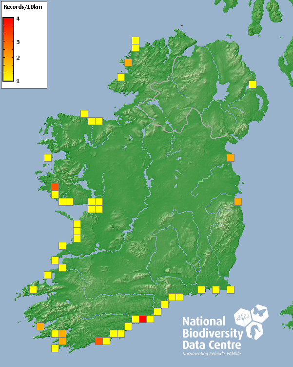 Distribution of the number of records recorded within each 10km grid square (ITM).Marine Map - 50km