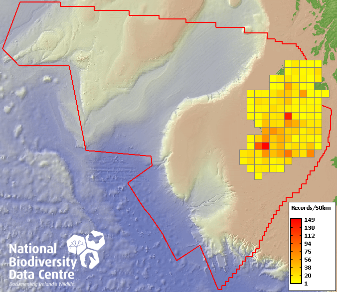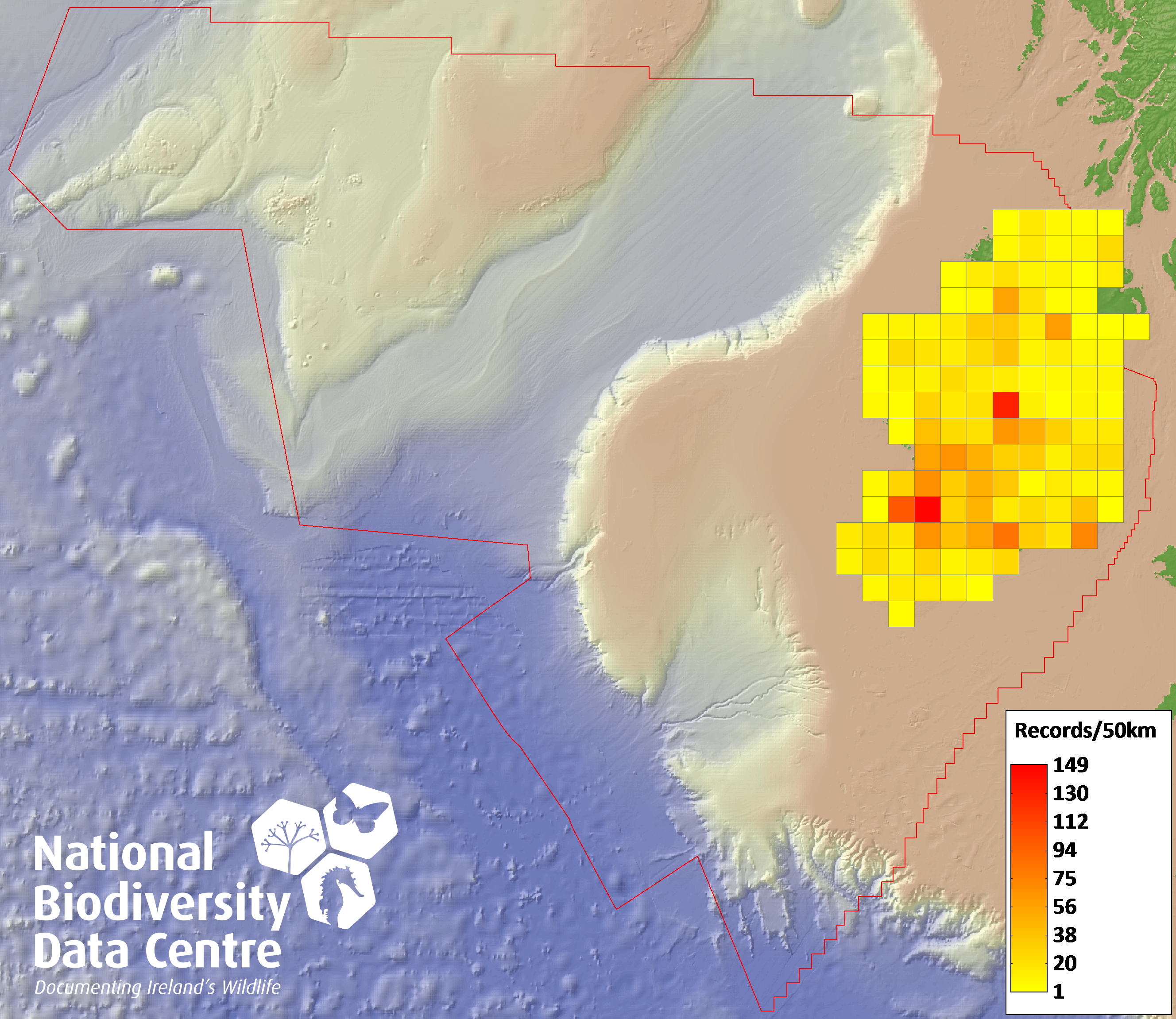 Distribution of the number of records recorded within each 10km grid square (ITM).Marine Map - 50km