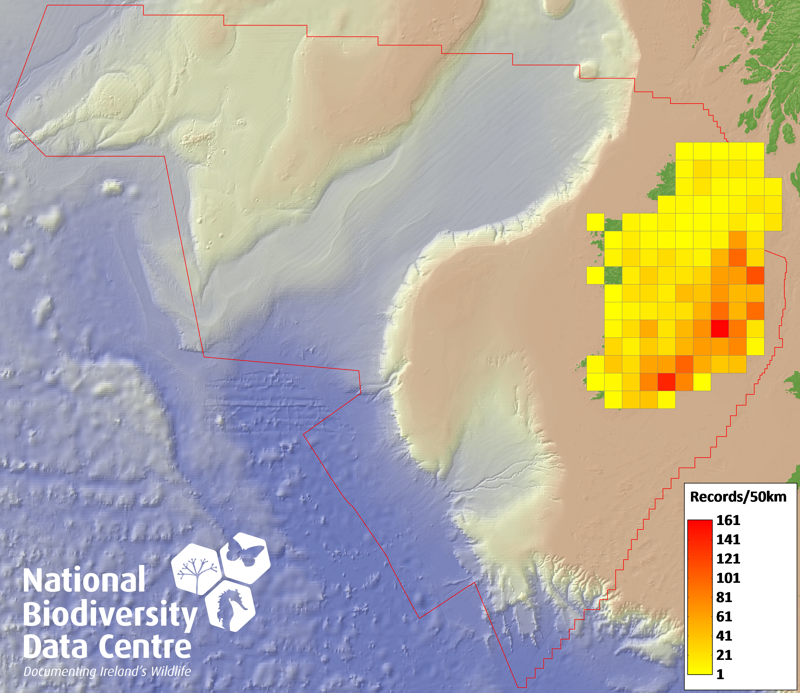 Distribution of the number of records recorded within each 10km grid square (ITM).Marine Map - 50km